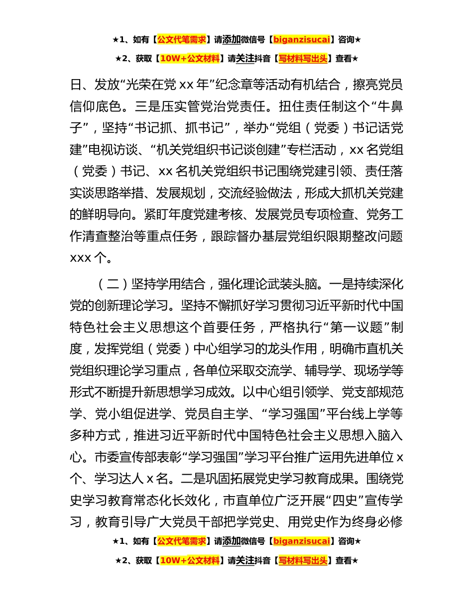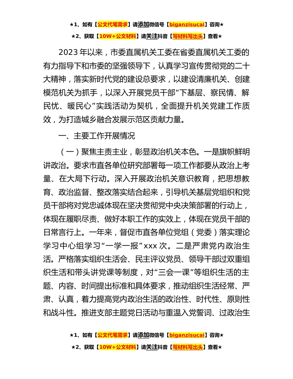 ★1、如有【公文代笔需求】请添加微信号【biganzisucai】咨询★★2、获取【10W+公文材料】请关注抖音【写材料写出头】查看★2023年以来,市委直属机关工委在省委直属机关工委的有力指导下和市委的坚强领导下,认真学习宣传贯彻党的二十大精神,落实新时代党的建设总要求,以建设清廉机关、创建“模范机关为抓手,以深入开展党员干部下基层、察民情、解”民忧、暖民心实践活动为契机,全面提升机关党建工作质效,为打造城乡融合发展示范区贡献力量。一、主要工作开展情况(一)聚焦主责主业,彰显政治机关本色。一是旗帜鲜明讲政治。要求市直各单位研究部署每一项工作都要从政治上考量、在大局下行动。深入开展政治机关意识教育,把思想教育、政治监督、整改落实结合起来,引导机关基层党组织和党员干部将对党忠诚...