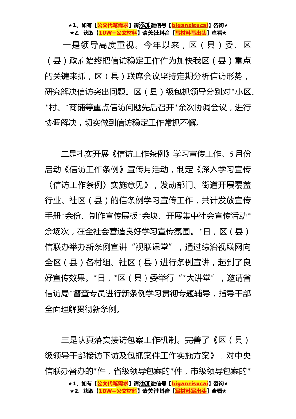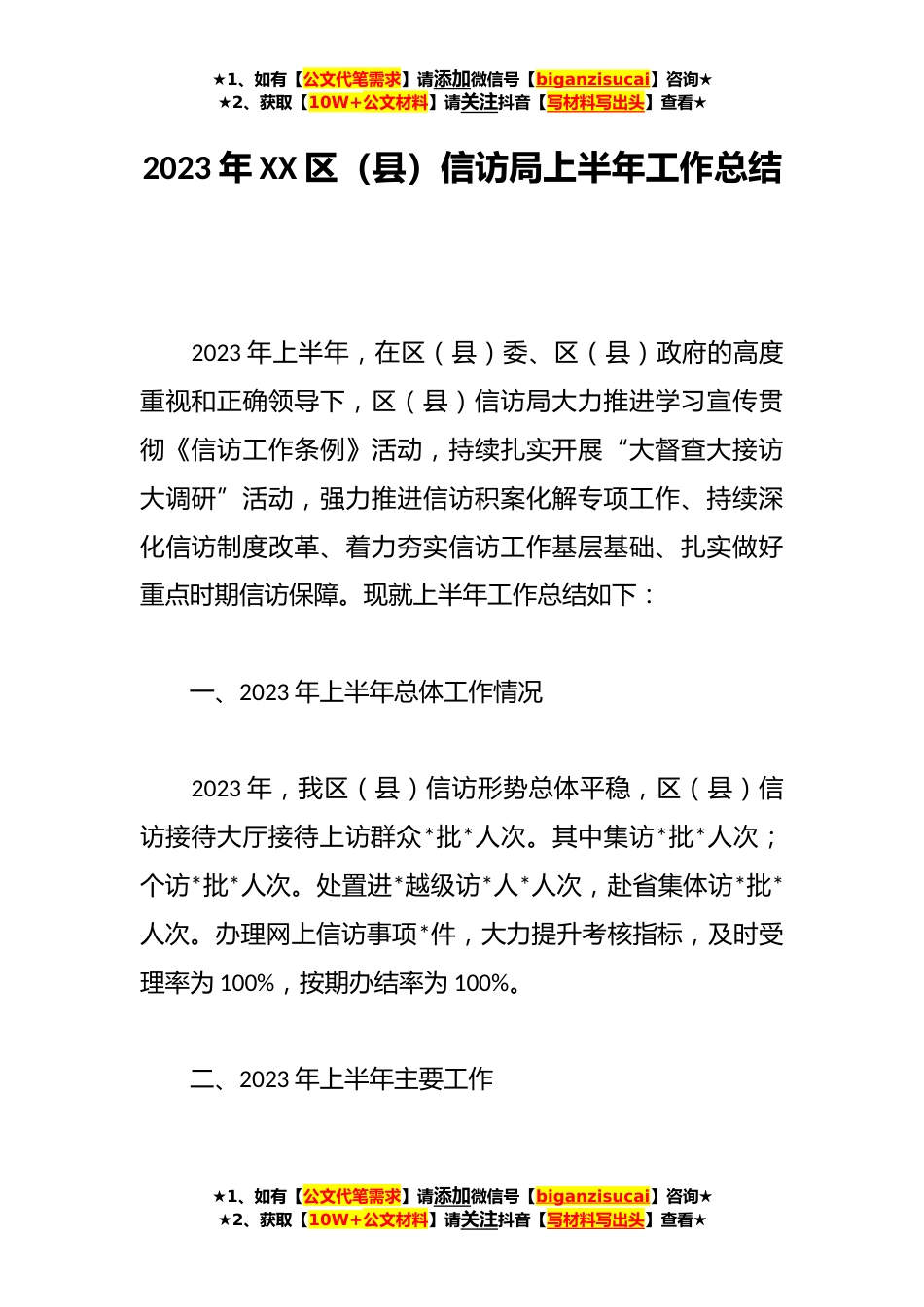 ★1、如有【公文代笔需求】请添加微信号【biganzisucai】咨询★★2、获取【10W+公文材料】请关注抖音【写材料写出头】查看★2023年XX区(县)信访局上半年工作总结2023年上半年,在区(县)委、区(县)政府的高度重视和正确领导下,区(县)信访局大力推进学习宣传贯彻《信访工作条例》活动,持续扎实开展“大督查大接访大调研”活动,强力推进信访积案化解专项工作、持续深化信访制度改革、着力夯实信访工作基层基础、扎实做好重点时期信访保障。现就上半年工作总结如下:一、2023年上半年总体工作情况2023年,我区(县)信访形势总体平稳,区(县)信访接待大厅接待上访群众*批*人次。其中集访*批*人次;个访*批*人次。处置进*越级访*人*人次,赴省集体访*批*人次。办理网上信访事项*件,大力提升考核指标,及...