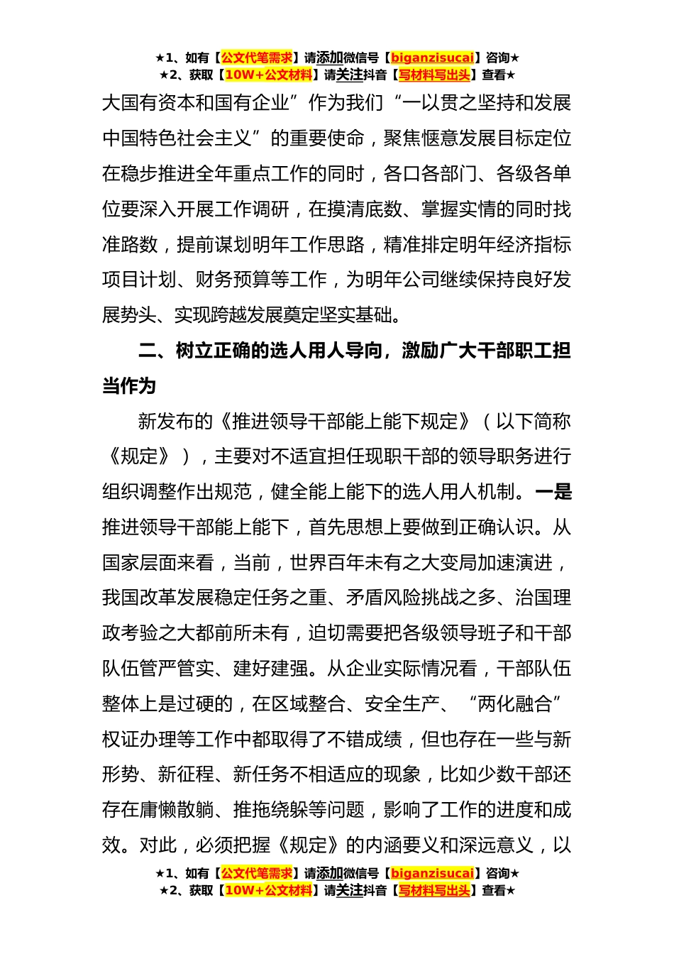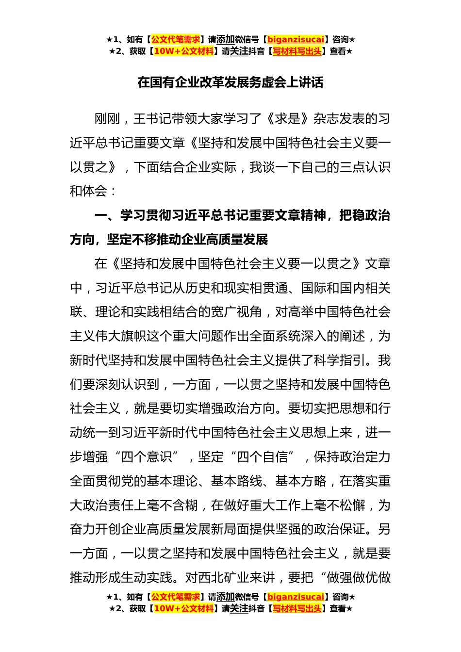 ★1、如有【公文代笔需求】请添加微信号【biganzisucai】咨询★★2、获取【10W+公文材料】请关注抖音【写材料写出头】查看★在国有企业改革发展务虚会上讲话刚刚,王书记带领大家学习了《求是》杂志发表的习近平总书记重要文章《坚持和发展中国特色社会主义要一以贯之》,下面结合企业实际,我谈一下自己的三点认识和体会:一、学习贯彻习近平总书记重要文章精神,把稳政治方向,坚定不移推动企业高质量发展在《坚持和发展中国特色社会主义要一以贯之》文章中,习近平总书记从历史和现实相贯通、国际和国内相关联、理论和实践相结合的宽广视角,对高举中国特色社会主义伟大旗帜这个重大问题作出全面系统深入的阐述,为新时代坚持和发展中国特色社会主义提供了科学指引。我们要深刻认识到,一方面,一以贯之坚持和...