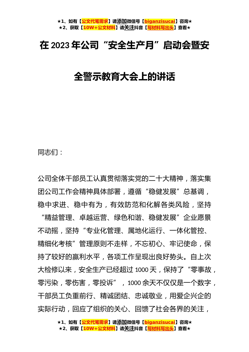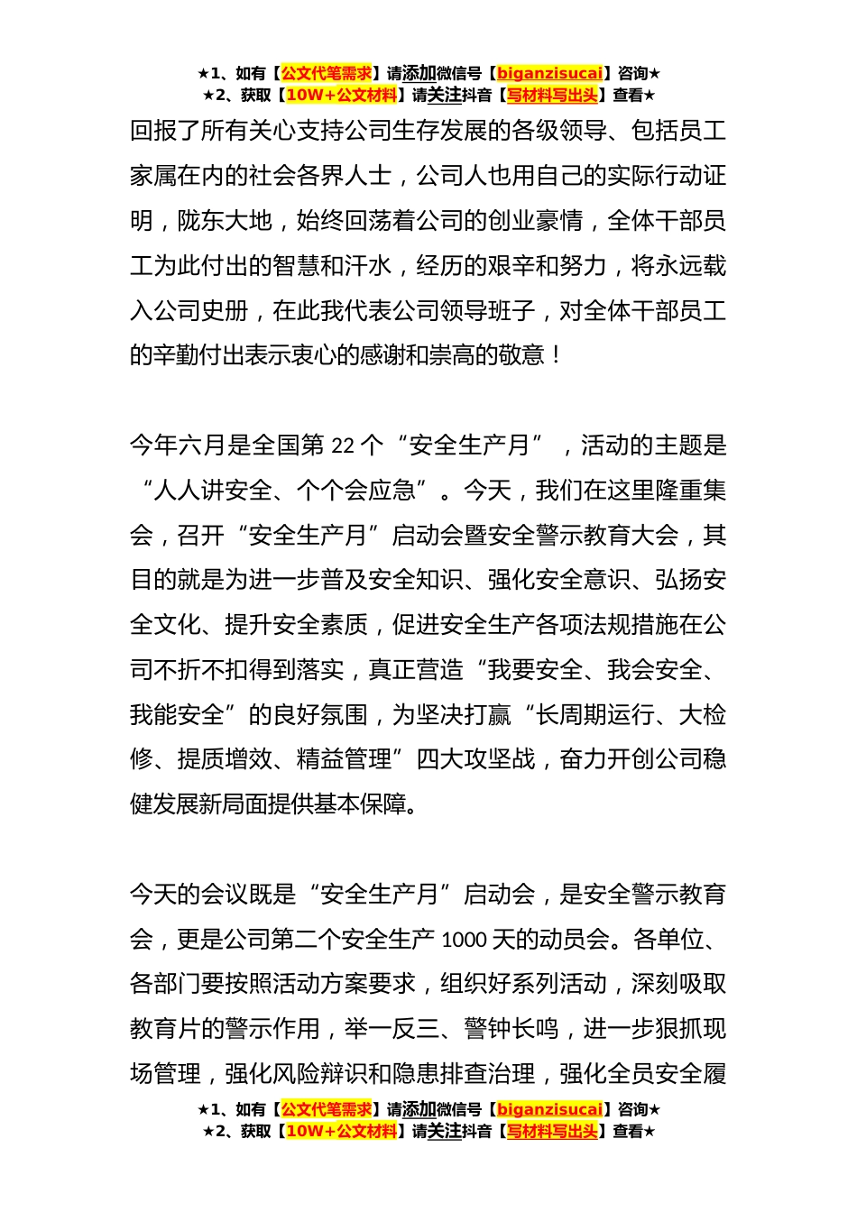 ★1、如有【公文代笔需求】请添加微信号【biganzisucai】咨询★★2、获取【10W+公文材料】请关注抖音【写材料写出头】查看★在2023年公司“安全生产月”启动会暨安全警示教育大会上的讲话同志们:公司全体干部员工认真贯彻落实党的二十大精神,落实集团公司工作会精神具体部署,遵循“稳健发展”总基调,稳中求进、稳中有为,有效防范和化解各类风险,坚持“精益管理、卓越运营、绿色和谐、稳健发展”企业愿景不动摇,坚持“专业化管理、属地化运行、一体化管控、精细化考核”管理原则不走样,不忘初心、牢记使命,保持了较好的赢利水平,各项工作呈现出良好势头。自上次大检修以来,安全生产已经超过1000天,保持了“零事故,零污染,零伤害,零投诉”,1000余天不仅仅是一个数字,干部员工负重前行、精诚团结、...