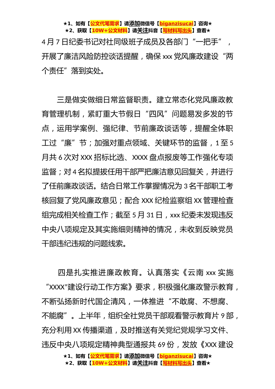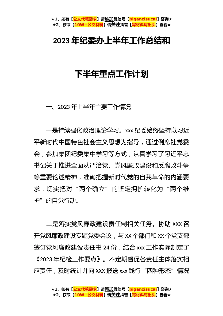 ★1、如有【公文代笔需求】请添加微信号【biganzisucai】咨询★★2、获取【10W+公文材料】请关注抖音【写材料写出头】查看★2023年纪委办上半年工作总结和下半年重点工作计划一、2023年上半年主要工作情况一是持续强化政治理论学习。xxx纪委始终坚持以习近平新时代中国特色社会主义思想为指导,通过例席社党委会,参加集团纪委集中学习等方式,认真学习了习近平总书记关于推进全面从严治党、党风廉政建设和反腐败斗争等重要论述精神,准确把握新时代党的自我革命的内涵要求,切实把对“两个确立”的坚定拥护转化为“两个维护”的自觉行动。二是落实党风廉政建设责任制相关任务。协助XXX召开党风廉政建设专题党委会议,与XX个部门和XX个党支部签订党风廉政建设责任书24份,结合xxx工作实际制定了《2023年纪检工作要...