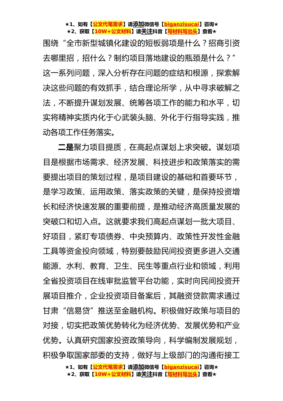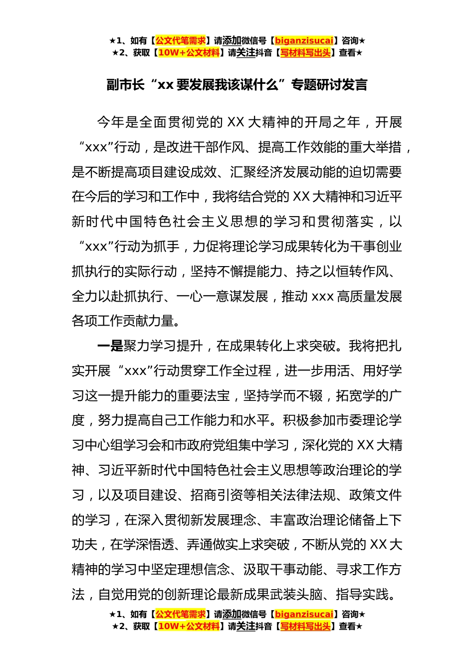 ★1、如有【公文代笔需求】请添加微信号【biganzisucai】咨询★★2、获取【10W+公文材料】请关注抖音【写材料写出头】查看★副市长“xx要发展我该谋什么”专题研讨发言今年是全面贯彻党的XX大精神的开局之年,开展“xxx”行动,是改进干部作风、提高工作效能的重大举措,是不断提高项目建设成效、汇聚经济发展动能的迫切需要在今后的学习和工作中,我将结合党的XX大精神和习近平新时代中国特色社会主义思想的学习和贯彻落实,以“xxx”行动为抓手,力促将理论学习成果转化为干事创业抓执行的实际行动,坚持不懈提能力、持之以恒转作风、全力以赴抓执行、一心一意谋发展,推动xxx高质量发展各项工作贡献力量。一是聚力学习提升,在成果转化上求突破。我将把扎实开展“xxx”行动贯穿工作全过程,进一步用活、用好学...