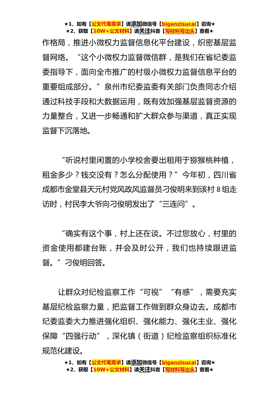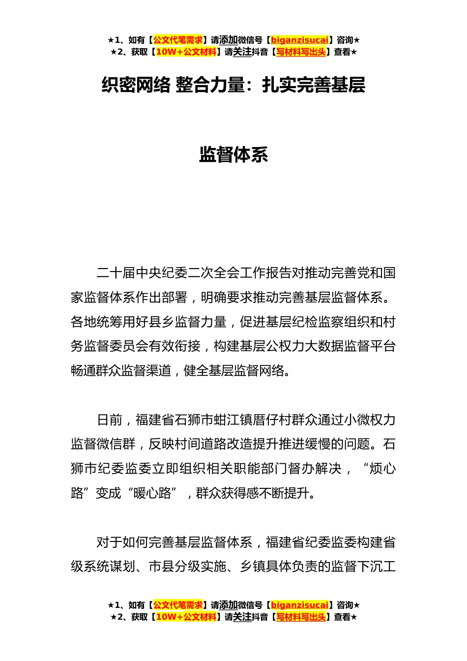 ★1、如有【公文代笔需求】请添加微信号【biganzisucai】咨询★★2、获取【10W+公文材料】请关注抖音【写材料写出头】查看★织密网络整合力量:扎实完善基层监督体系二十届中央纪委二次全会工作报告对推动完善党和国家监督体系作出部署,明确要求推动完善基层监督体系。各地统筹用好县乡监督力量,促进基层纪检监察组织和村务监督委员会有效衔接,构建基层公权力大数据监督平台畅通群众监督渠道,健全基层监督网络。日前,福建省石狮市蚶江镇厝仔村群众通过小微权力监督微信群,反映村间道路改造提升推进缓慢的问题。石狮市纪委监委立即组织相关职能部门督办解决,“烦心路”变成“暖心路”,群众获得感不断提升。对于如何完善基层监督体系,福建省纪委监委构建省级系统谋划、市县分级实施、乡镇具体负责的监督下...
