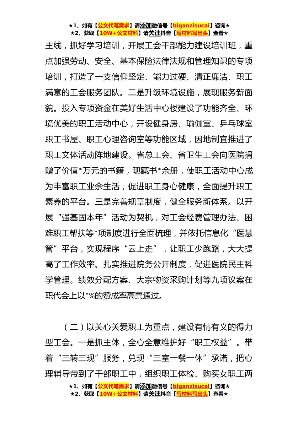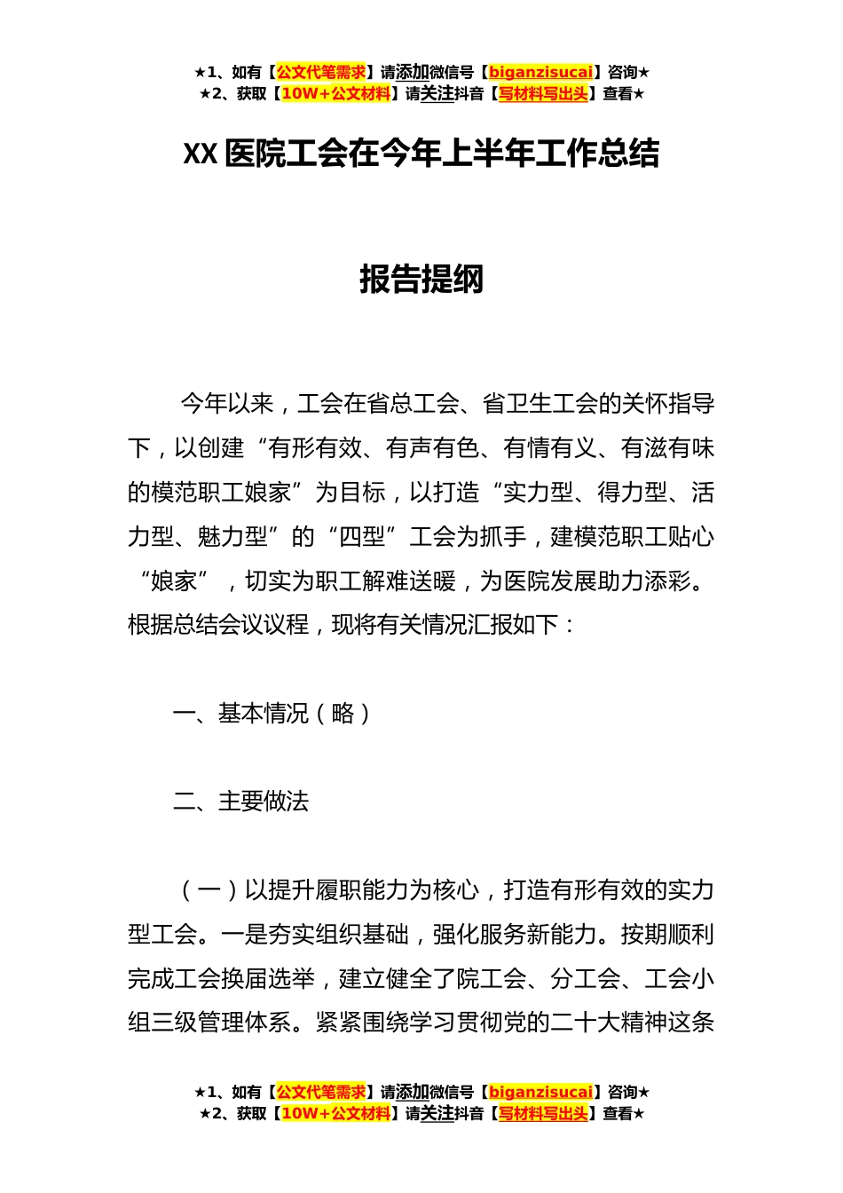 ★1、如有【公文代笔需求】请添加微信号【biganzisucai】咨询★★2、获取【10W+公文材料】请关注抖音【写材料写出头】查看★XX医院工会在今年上半年工作总结报告提纲今年以来,工会在省总工会、省卫生工会的关怀指导下,以创建“有形有效、有声有色、有情有义、有滋有味的模范职工娘家”为目标,以打造“实力型、得力型、活力型、魅力型”的“四型”工会为抓手,建模范职工贴心“娘家”,切实为职工解难送暖,为医院发展助力添彩。根据总结会议议程,现将有关情况汇报如下:一、基本情况(略)二、主要做法(一)以提升履职能力为核心,打造有形有效的实力型工会。一是夯实组织基础,强化服务新能力。按期顺利完成工会换届选举,建立健全了院工会、分工会、工会小组三级管理体系。紧紧围绕学习贯彻党的二十大精神...