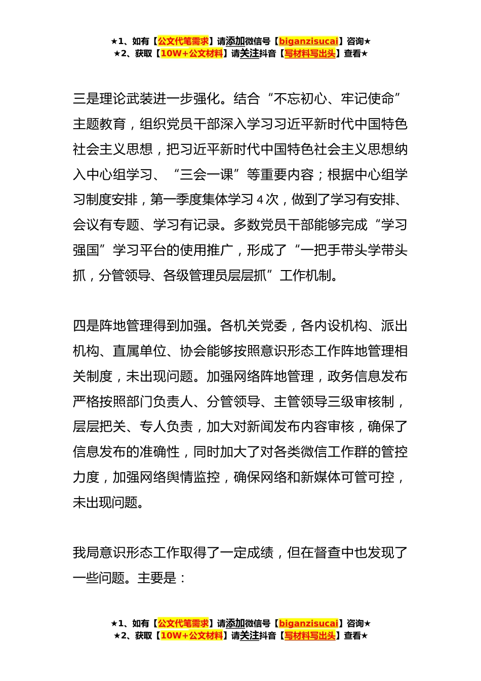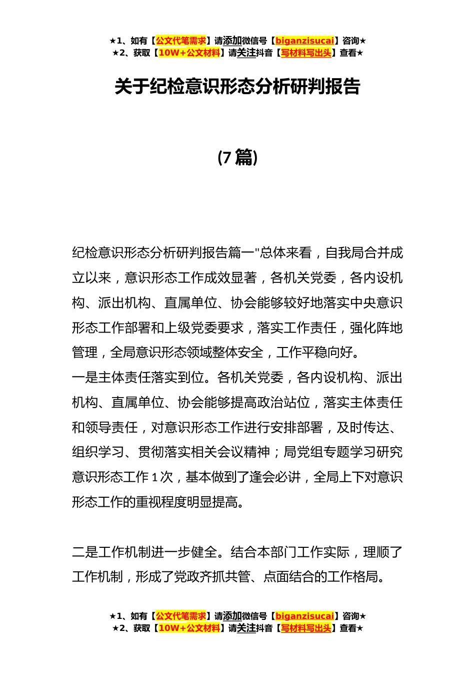 ★1、如有【公文代笔需求】请添加微信号【biganzisucai】咨询★★2、获取【10W+公文材料】请关注抖音【写材料写出头】查看★关于纪检意识形态分析研判报告(7篇)纪检意识形态分析研判报告篇一"总体来看,自我局合并成立以来,意识形态工作成效显著,各机关党委,各内设机构、派出机构、直属单位、协会能够较好地落实中央意识形态工作部署和上级党委要求,落实工作责任,强化阵地管理,全局意识形态领域整体安全,工作平稳向好。一是主体责任落实到位。各机关党委,各内设机构、派出机构、直属单位、协会能够提高政治站位,落实主体责任和领导责任,对意识形态工作进行安排部署,及时传达、组织学习、贯彻落实相关会议精神;局党组专题学习研究意识形态工作1次,基本做到了逢会必讲,全局上下对意识形态工作的重视程...