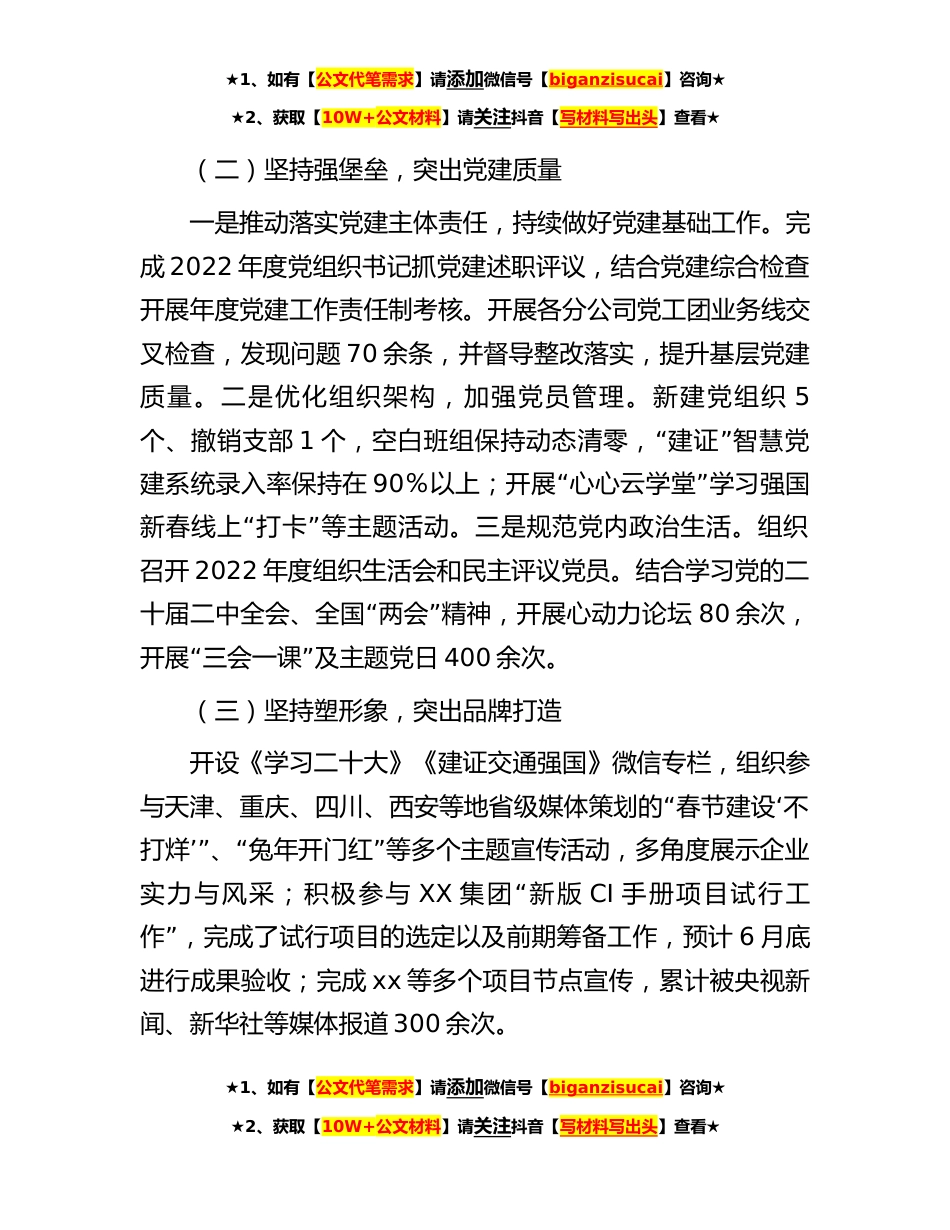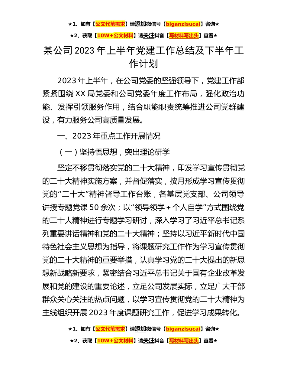 ★1、如有【公文代笔需求】请添加微信号【biganzisucai】咨询★★2、获取【10W+公文材料】请关注抖音【写材料写出头】查看★某公司2023年上半年党建工作总结及下半年工作计划2023年上半年,在公司党委的坚强领导下,党建工作部紧紧围绕XX局党委和公司党委年度工作布局,强化政治功能、发挥引领服务作用,结合职能职责统筹推进公司党群建设,有力服务公司高质量发展。一、2023年重点工作开展情况(一)坚持悟思想,突出理论研学坚定不移贯彻落实党的二十大精神,印发学习宣传贯彻党的二十大精神实施方案,并督促落实,按月形成学习宣传贯彻“”党的二十大精神督导工作台账,各基层党支部、公司领导讲授专题党课50“”余次;以领导领学+个人自学方式围绕党的二十大精神进行专题学习研讨,深入学习了习近平总书记系...