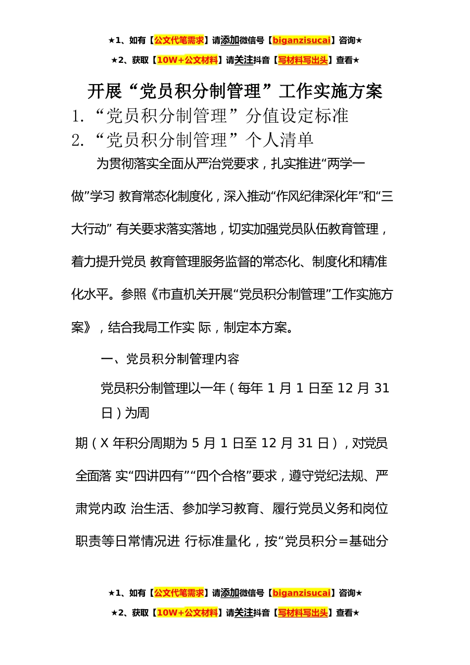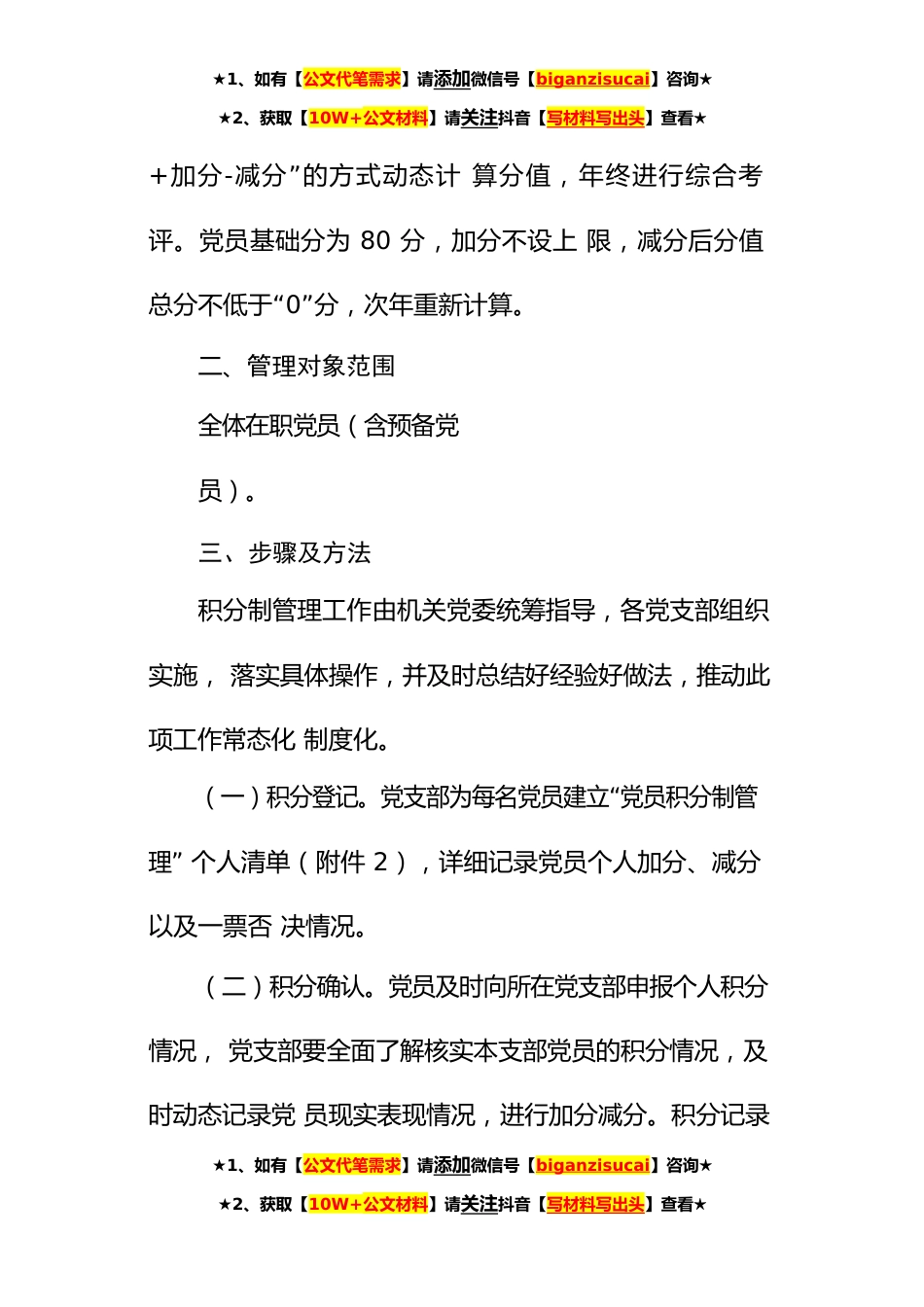 ★1、如有【公文代笔需求】请添加微信号【biganzisucai】咨询★★2、获取【10W+公文材料】请关注抖音【写材料写出头】查看★开展“党员积分制管理”工作实施方案1.“党员积分制管理”分值设定标准2.“党员积分制管理”个人清单“为贯彻落实全面从严治党要求,扎实推进两学一”做学习“”“教育常态化制度化,深入推动作风纪律深化年和三”大行动有关要求落实落地,切实加强党员队伍教育管理,着力提升党员教育管理服务监督的常态化、制度化和精准化水平。参照《市直“”机关开展党员积分制管理工作实施方案》,结合我局工作实际,制定本方案。一、党员积分制管理内容党员积分制管理以一年(每年1月1日至12月31日)为周期(X年积分周期为5月1日至12月31日),对党员全面落“”“”实四讲四有四个合格要求,遵守党纪...