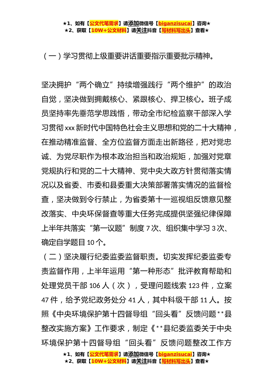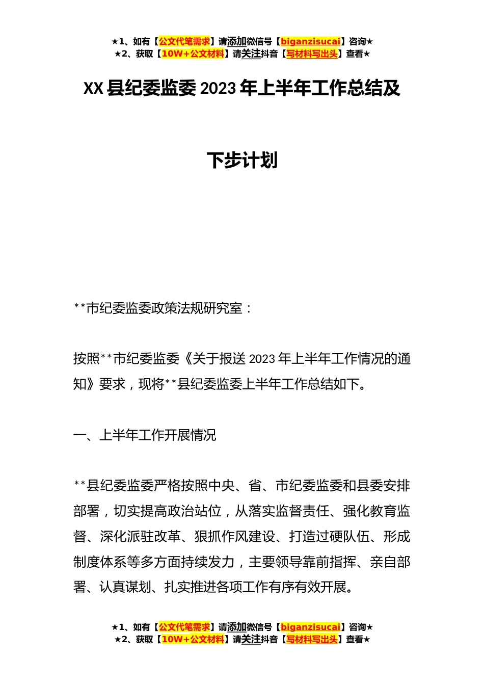 ★1、如有【公文代笔需求】请添加微信号【biganzisucai】咨询★★2、获取【10W+公文材料】请关注抖音【写材料写出头】查看★XX县纪委监委2023年上半年工作总结及下步计划**市纪委监委政策法规研究室:按照**市纪委监委《关于报送2023年上半年工作情况的通知》要求,现将**县纪委监委上半年工作总结如下。一、上半年工作开展情况**县纪委监委严格按照中央、省、市纪委监委和县委安排部署,切实提高政治站位,从落实监督责任、强化教育监督、深化派驻改革、狠抓作风建设、打造过硬队伍、形成制度体系等多方面持续发力,主要领导靠前指挥、亲自部署、认真谋划、扎实推进各项工作有序有效开展。★1、如有【公文代笔需求】请添加微信号【biganzisucai】咨询★★2、获取【10W+公文材料】请关注抖音【写材料写出头】查看...