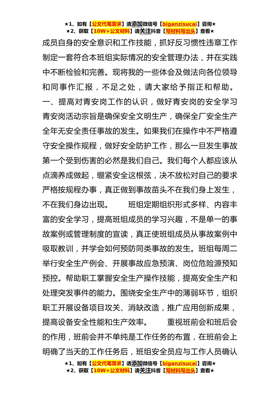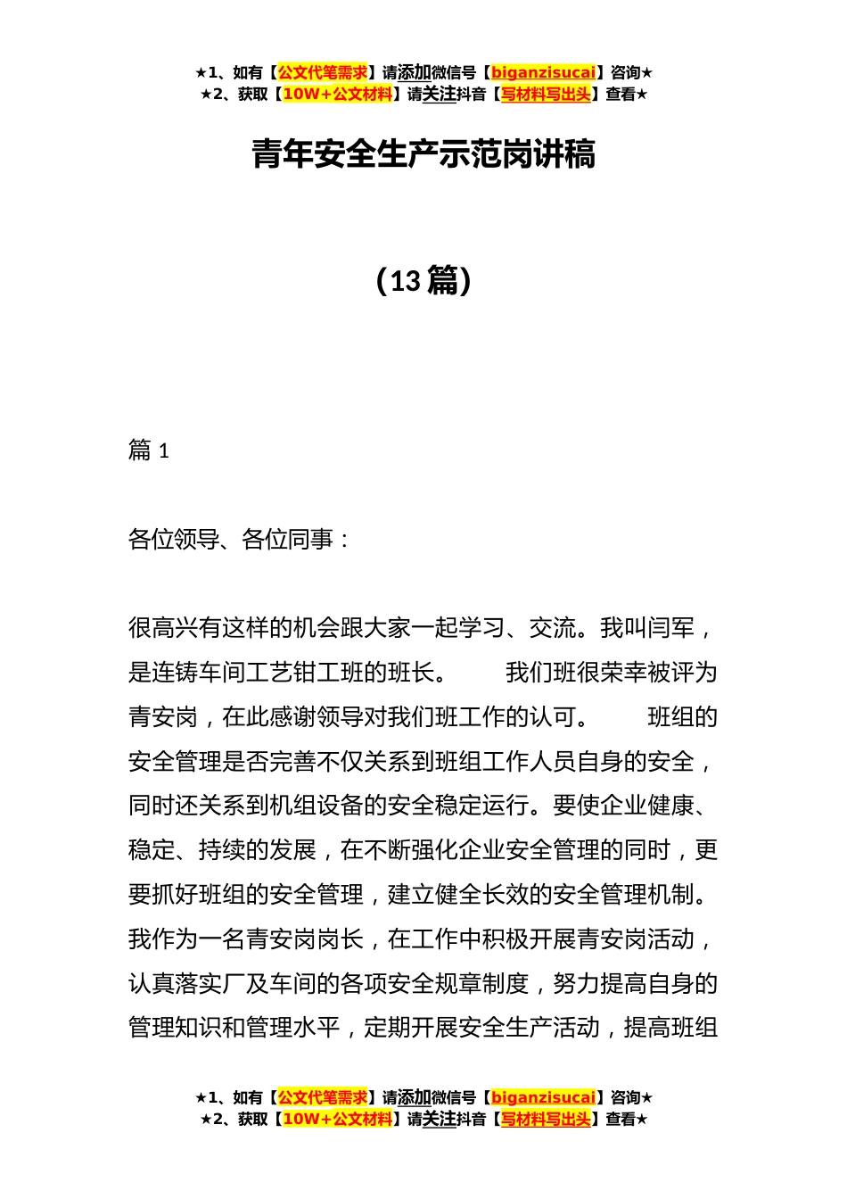 ★1、如有【公文代笔需求】请添加微信号【biganzisucai】咨询★★2、获取【10W+公文材料】请关注抖音【写材料写出头】查看★青年安全生产示范岗讲稿(13篇)篇1各位领导、各位同事:很高兴有这样的机会跟大家一起学习、交流。我叫闫军,是连铸车间工艺钳工班的班长。我们班很荣幸被评为青安岗,在此感谢领导对我们班工作的认可。班组的安全管理是否完善不仅关系到班组工作人员自身的安全,同时还关系到机组设备的安全稳定运行。要使企业健康、稳定、持续的发展,在不断强化企业安全管理的同时,更要抓好班组的安全管理,建立健全长效的安全管理机制。我作为一名青安岗岗长,在工作中积极开展青安岗活动,认真落实厂及车间的各项安全规章制度,努力提高自身的管理知识和管理水平,定期开展安全生产活动,提高班组★...