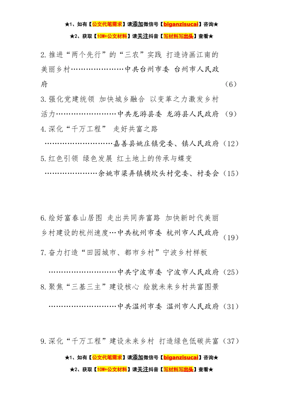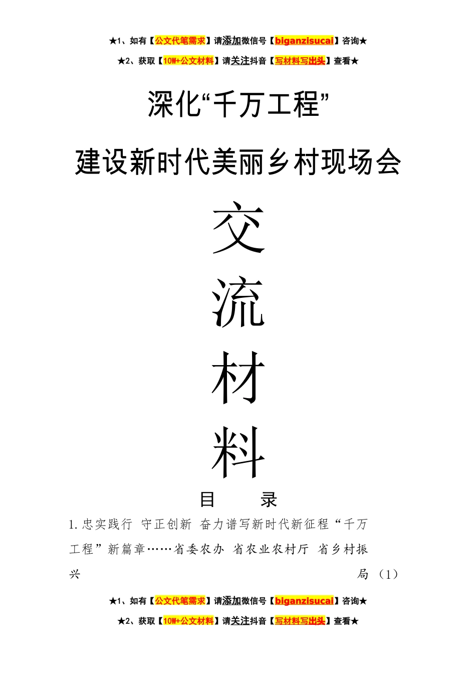 ★1、如有【公文代笔需求】请添加微信号【biganzisucai】咨询★★2、获取【10W+公文材料】请关注抖音【写材料写出头】查看★深化“千万工程”建设新时代美丽乡村现场会交流材料目录1.忠实践行守正创新奋力谱写新时代新征程“千万工程”新篇章……省委农办省农业农村厅省乡村振兴局(1)★1、如有【公文代笔需求】请添加微信号【biganzisucai】咨询★★2、获取【10W+公文材料】请关注抖音【写材料写出头】查看★★1、如有【公文代笔需求】请添加微信号【biganzisucai】咨询★★2、获取【10W+公文材料】请关注抖音【写材料写出头】查看★2.推进“两个先行”的“三农”实践打造诗画江南的美丽乡村…………………中共台州市委台州市人民政府(6)3.强化党建统领加快城乡融合以变革之力激发乡村活力……………………中...