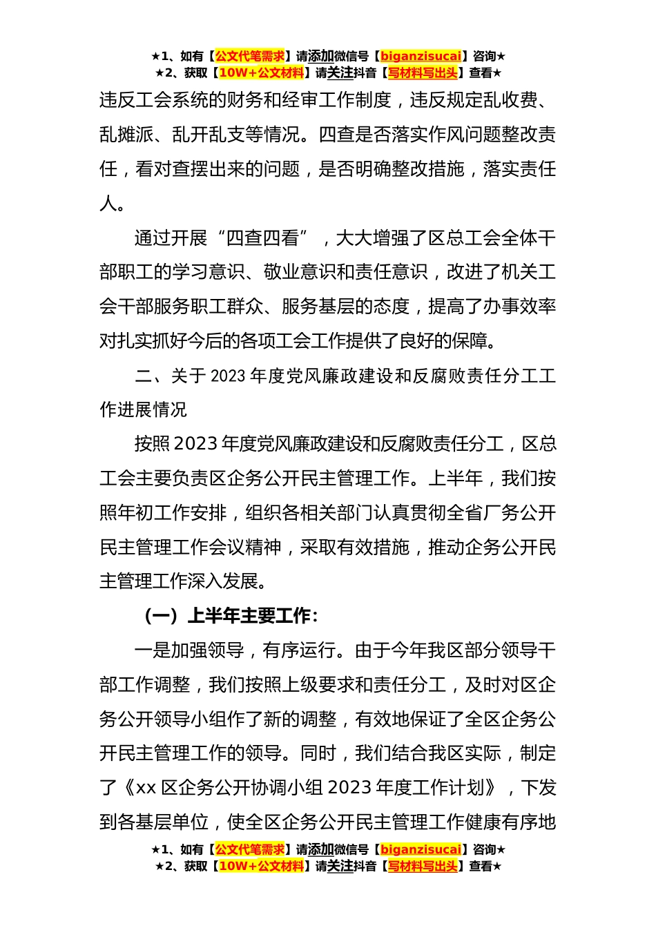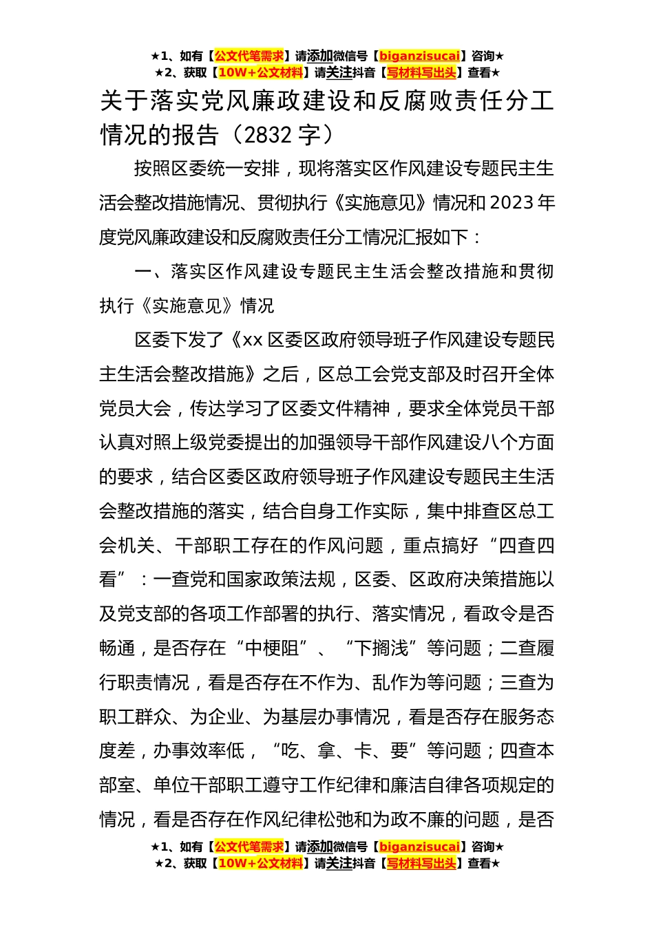 ★1、如有【公文代笔需求】请添加微信号【biganzisucai】咨询★★2、获取【10W+公文材料】请关注抖音【写材料写出头】查看★关于落实党风廉政建设和反腐败责任分工情况的报告(2832字)按照区委统一安排,现将落实区作风建设专题民主生活会整改措施情况、贯彻执行《实施意见》情况和2023年度党风廉政建设和反腐败责任分工情况汇报如下:一、落实区作风建设专题民主生活会整改措施和贯彻执行《实施意见》情况区委下发了《xx区委区政府领导班子作风建设专题民主生活会整改措施》之后,区总工会党支部及时召开全体党员大会,传达学习了区委文件精神,要求全体党员干部认真对照上级党委提出的加强领导干部作风建设八个方面的要求,结合区委区政府领导班子作风建设专题民主生活会整改措施的落实,结合自身工作实际,集...