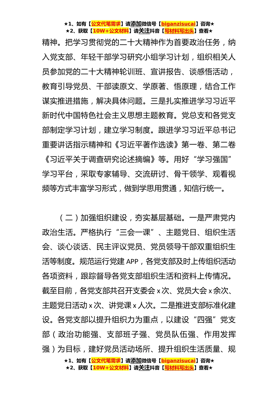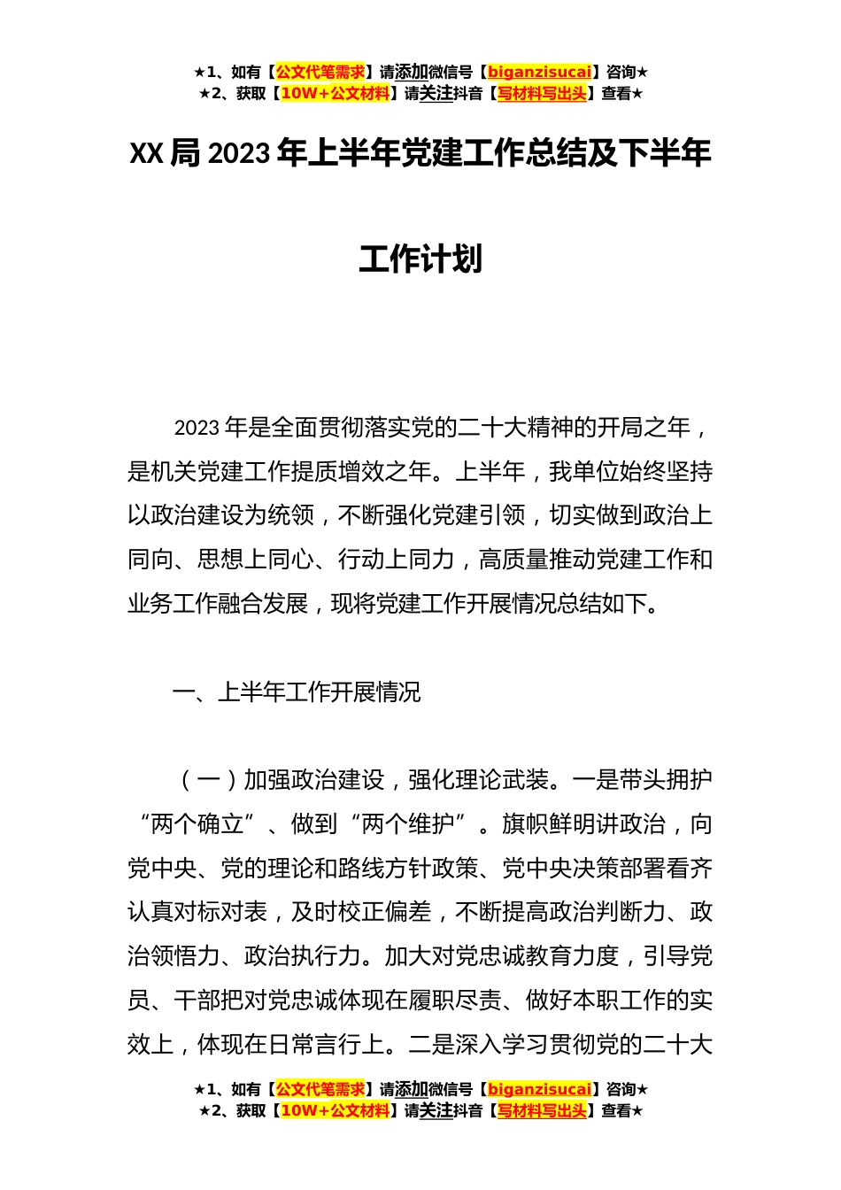 ★1、如有【公文代笔需求】请添加微信号【biganzisucai】咨询★★2、获取【10W+公文材料】请关注抖音【写材料写出头】查看★XX局2023年上半年党建工作总结及下半年工作计划2023年是全面贯彻落实党的二十大精神的开局之年,是机关党建工作提质增效之年。上半年,我单位始终坚持以政治建设为统领,不断强化党建引领,切实做到政治上同向、思想上同心、行动上同力,高质量推动党建工作和业务工作融合发展,现将党建工作开展情况总结如下。一、上半年工作开展情况(一)加强政治建设,强化理论武装。一是带头拥护“两个确立”、做到“两个维护”。旗帜鲜明讲政治,向党中央、党的理论和路线方针政策、党中央决策部署看齐认真对标对表,及时校正偏差,不断提高政治判断力、政治领悟力、政治执行力。加大对党忠诚教育力...