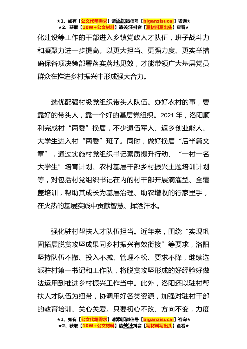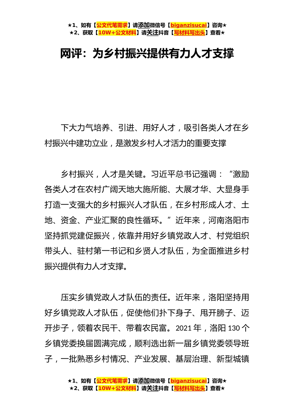 ★1、如有【公文代笔需求】请添加微信号【biganzisucai】咨询★★2、获取【10W+公文材料】请关注抖音【写材料写出头】查看★网评:为乡村振兴提供有力人才支撑下大力气培养、引进、用好人才,吸引各类人才在乡村振兴中建功立业,是激发乡村人才活力的重要支撑乡村振兴,人才是关键。习近平总书记强调:“激励各类人才在农村广阔天地大施所能、大展才华、大显身手打造一支强大的乡村振兴人才队伍,在乡村形成人才、土地、资金、产业汇聚的良性循环。”近年来,河南洛阳市坚持抓党建促振兴,依靠并用好乡镇党政人才、村党组织带头人、驻村第一书记和乡贤人才队伍,为全面推进乡村振兴提供有力人才支撑。压实乡镇党政人才队伍的责任。近年来,洛阳坚持用好乡镇党政人才队伍,促使他们扑下身子、甩开膀子、迈开步子,...