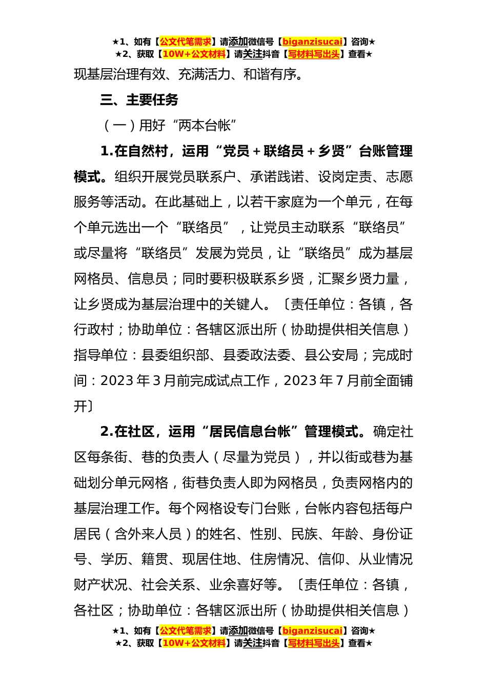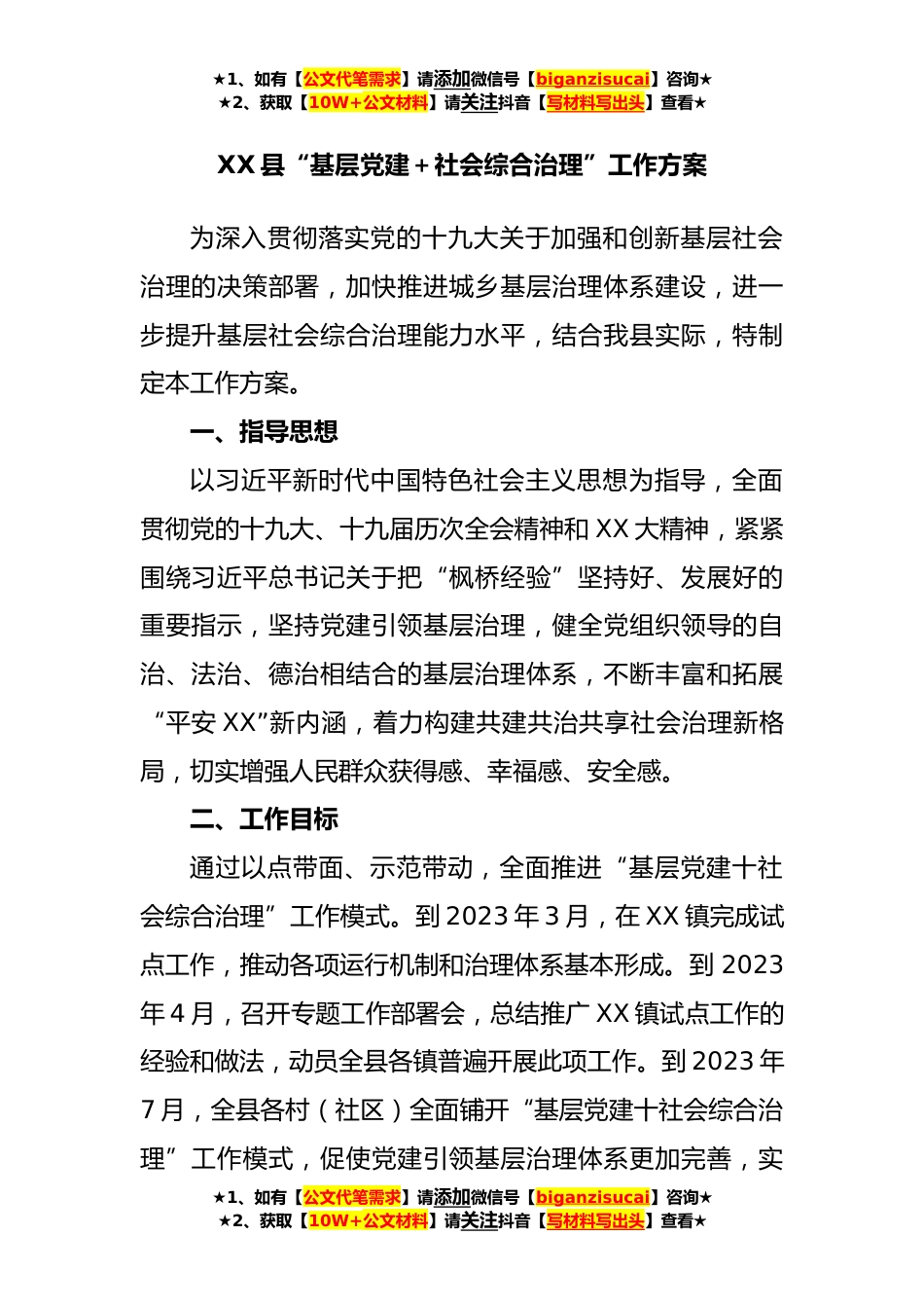 ★1、如有【公文代笔需求】请添加微信号【biganzisucai】咨询★★2、获取【10W+公文材料】请关注抖音【写材料写出头】查看★XX县“基层党建+社会综合治理”工作方案为深入贯彻落实党的十九大关于加强和创新基层社会治理的决策部署,加快推进城乡基层治理体系建设,进一步提升基层社会综合治理能力水平,结合我县实际,特制定本工作方案。一、指导思想以习近平新时代中国特色社会主义思想为指导,全面贯彻党的十九大、十九届历次全会精神和XX大精神,紧紧围绕习近平总书记关于把“枫桥经验”坚持好、发展好的重要指示,坚持党建引领基层治理,健全党组织领导的自治、法治、德治相结合的基层治理体系,不断丰富和拓展“平安XX”新内涵,着力构建共建共治共享社会治理新格局,切实增强人民群众获得感、幸福感、安全...
