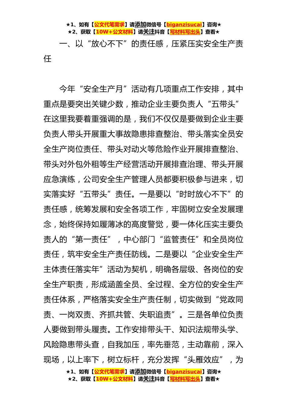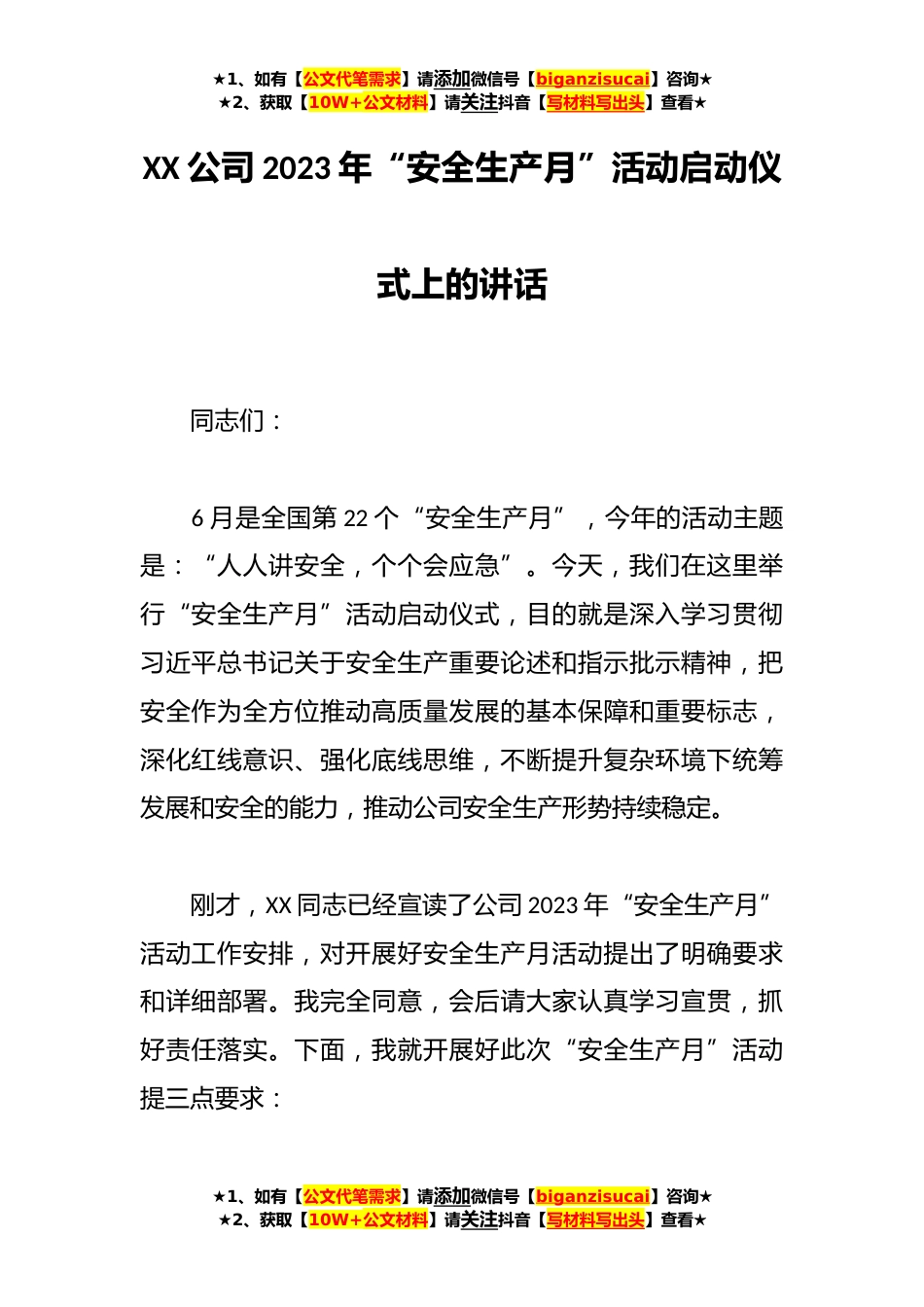 ★1、如有【公文代笔需求】请添加微信号【biganzisucai】咨询★★2、获取【10W+公文材料】请关注抖音【写材料写出头】查看★XX公司2023年“安全生产月”活动启动仪式上的讲话同志们:6月是全国第22个“安全生产月”,今年的活动主题是:“人人讲安全,个个会应急”。今天,我们在这里举行“安全生产月”活动启动仪式,目的就是深入学习贯彻习近平总书记关于安全生产重要论述和指示批示精神,把安全作为全方位推动高质量发展的基本保障和重要标志,深化红线意识、强化底线思维,不断提升复杂环境下统筹发展和安全的能力,推动公司安全生产形势持续稳定。刚才,XX同志已经宣读了公司2023年“安全生产月”活动工作安排,对开展好安全生产月活动提出了明确要求和详细部署。我完全同意,会后请大家认真学习宣贯,抓好责...