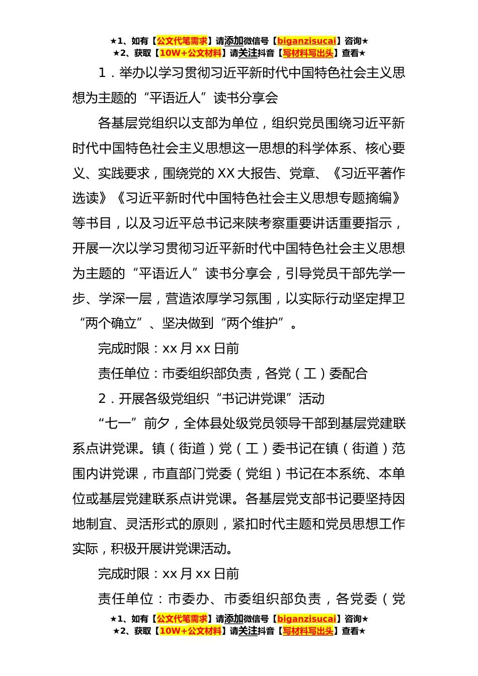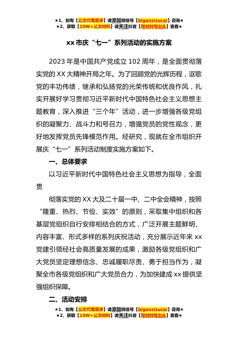 ★1、如有【公文代笔需求】请添加微信号【biganzisucai】咨询★★2、获取【10W+公文材料】请关注抖音【写材料写出头】查看★xx市庆“七一”系列活动的实施方案2023年是中国共产党成立102周年,是全面贯彻落实党的XX大精神开局之年。为了回顾党的光辉历程,讴歌党的丰功伟绩,继承和弘扬党的光荣传统和优良作风,扎实开展好学习贯彻习近平新时代中国特色社会主义思想主题教育,深入推进“三个年”活动,进一步增强各级党组织的凝聚力、战斗力和号召力,增强党员的党性观念,更好地发挥党员先锋模范作用。经研究,现就在全市组织开展庆“七一”系列活动制度实施方案如下。一、总体要求以习近平新时代中国特色社会主义思想为指导,全面贯彻落实党的XX大及二十届一中、二中全会精神,按照“隆重、热烈、节俭、实效”的...