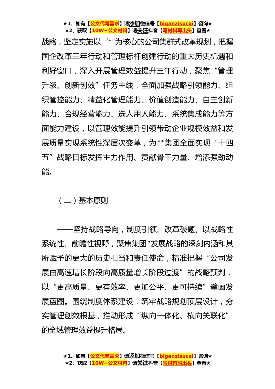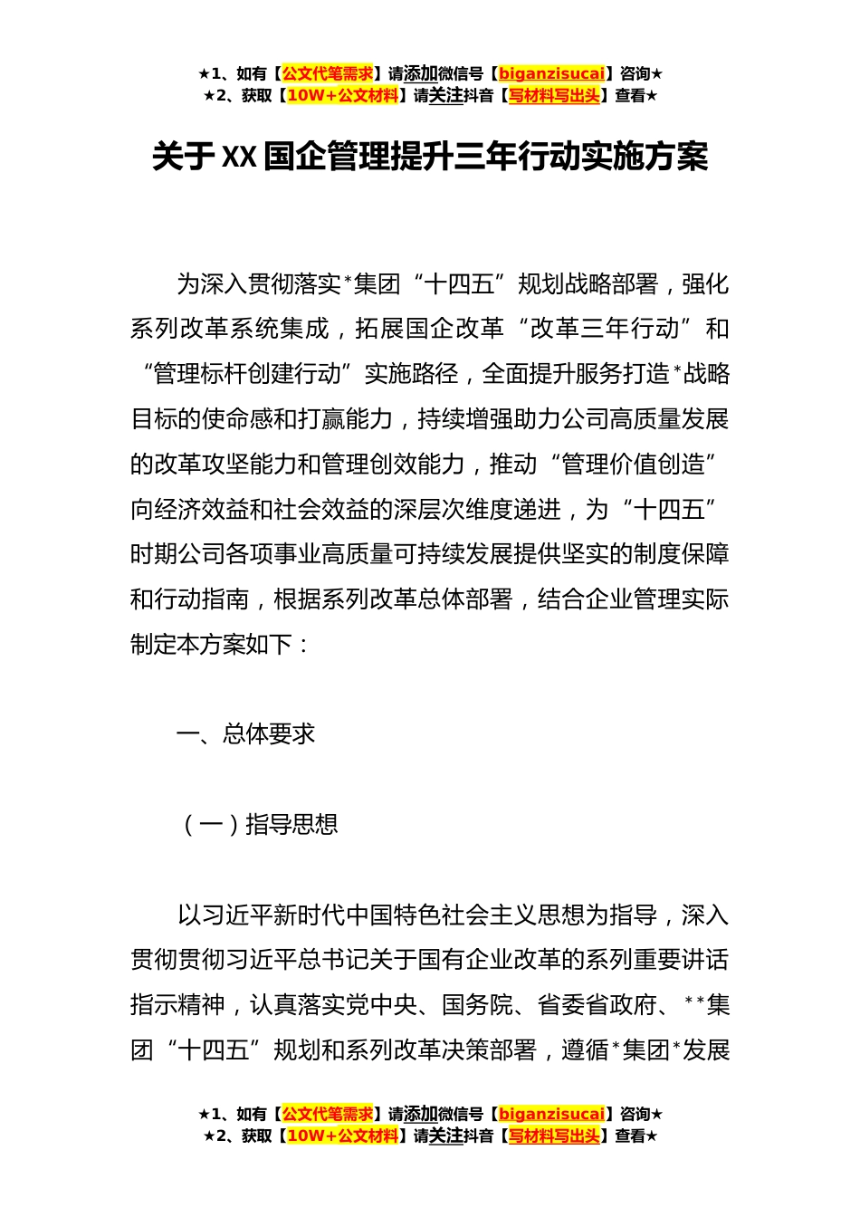 ★1、如有【公文代笔需求】请添加微信号【biganzisucai】咨询★★2、获取【10W+公文材料】请关注抖音【写材料写出头】查看★关于XX国企管理提升三年行动实施方案为深入贯彻落实*集团“十四五”规划战略部署,强化系列改革系统集成,拓展国企改革“改革三年行动”和“管理标杆创建行动”实施路径,全面提升服务打造*战略目标的使命感和打赢能力,持续增强助力公司高质量发展的改革攻坚能力和管理创效能力,推动“管理价值创造”向经济效益和社会效益的深层次维度递进,为“十四五”时期公司各项事业高质量可持续发展提供坚实的制度保障和行动指南,根据系列改革总体部署,结合企业管理实际制定本方案如下:一、总体要求(一)指导思想以习近平新时代中国特色社会主义思想为指导,深入贯彻贯彻习近平总书记关于国有...