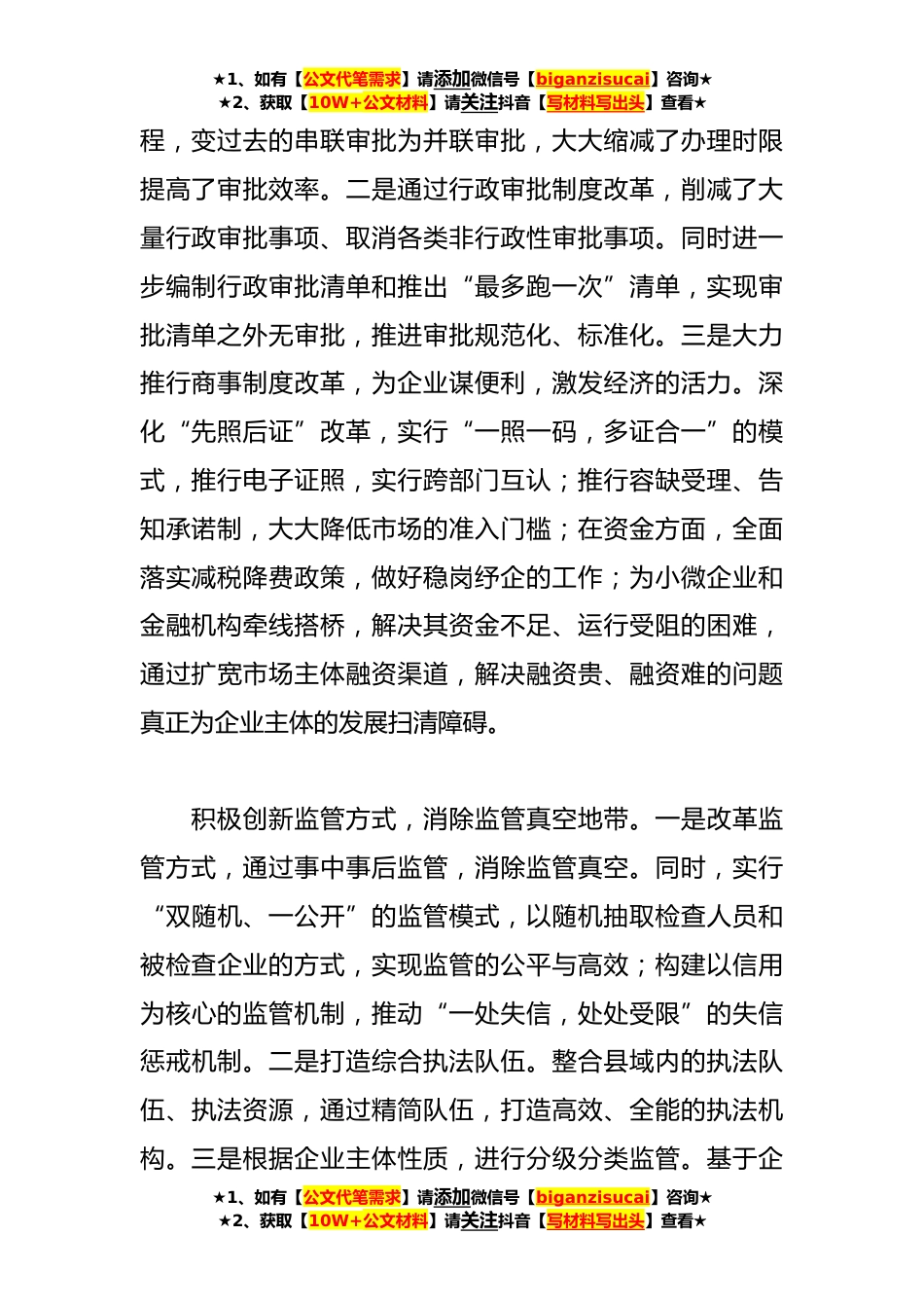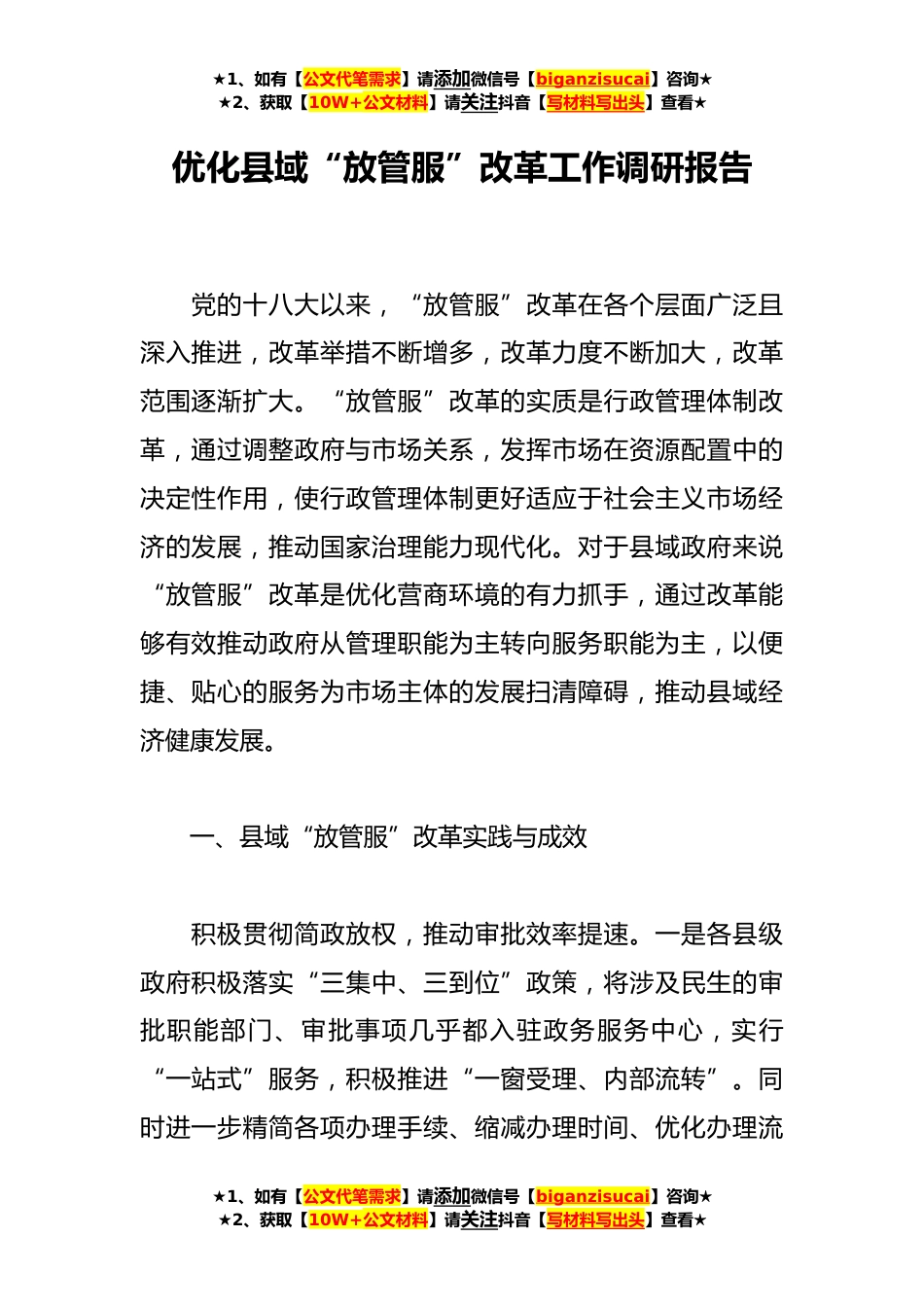 ★1、如有【公文代笔需求】请添加微信号【biganzisucai】咨询★★2、获取【10W+公文材料】请关注抖音【写材料写出头】查看★优化县域“放管服”改革工作调研报告党的十八大以来,“放管服”改革在各个层面广泛且深入推进,改革举措不断增多,改革力度不断加大,改革范围逐渐扩大。“放管服”改革的实质是行政管理体制改革,通过调整政府与市场关系,发挥市场在资源配置中的决定性作用,使行政管理体制更好适应于社会主义市场经济的发展,推动国家治理能力现代化。对于县域政府来说“放管服”改革是优化营商环境的有力抓手,通过改革能够有效推动政府从管理职能为主转向服务职能为主,以便捷、贴心的服务为市场主体的发展扫清障碍,推动县域经济健康发展。一、县域“放管服”改革实践与成效积极贯彻简政放权,推动...