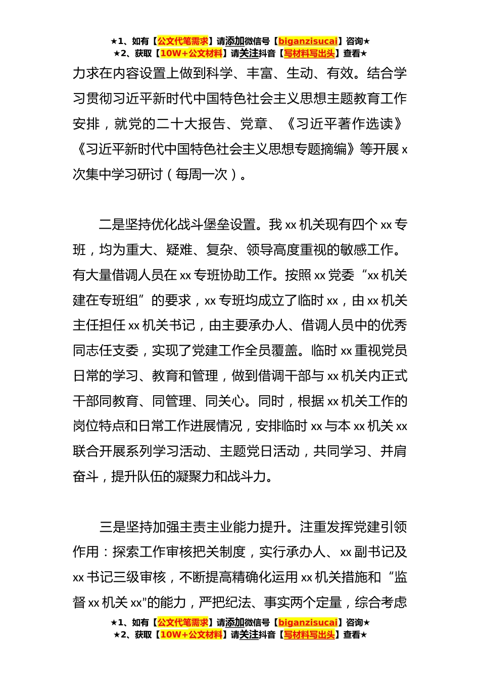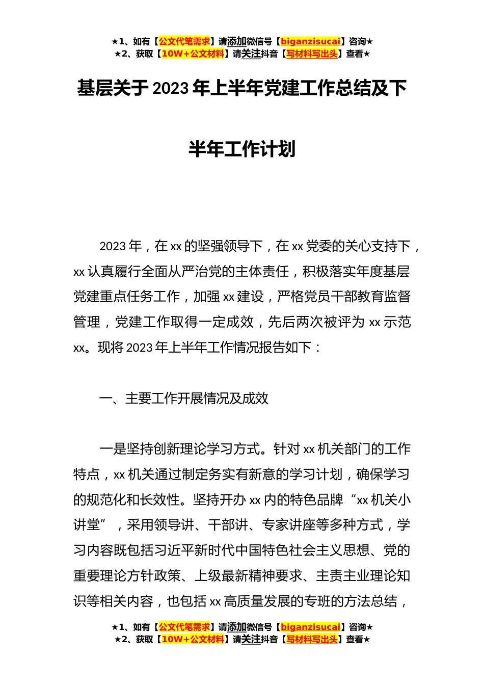 ★1、如有【公文代笔需求】请添加微信号【biganzisucai】咨询★★2、获取【10W+公文材料】请关注抖音【写材料写出头】查看★基层关于2023年上半年党建工作总结及下半年工作计划2023年,在xx的坚强领导下,在xx党委的关心支持下,xx认真履行全面从严治党的主体责任,积极落实年度基层党建重点任务工作,加强xx建设,严格党员干部教育监督管理,党建工作取得一定成效,先后两次被评为xx示范xx。现将2023年上半年工作情况报告如下:一、主要工作开展情况及成效一是坚持创新理论学习方式。针对xx机关部门的工作特点,xx机关通过制定务实有新意的学习计划,确保学习的规范化和长效性。坚持开办xx内的特色品牌“xx机关小讲堂”,采用领导讲、干部讲、专家讲座等多种方式,学习内容既包括习近平新时代中国特色社会主义思...