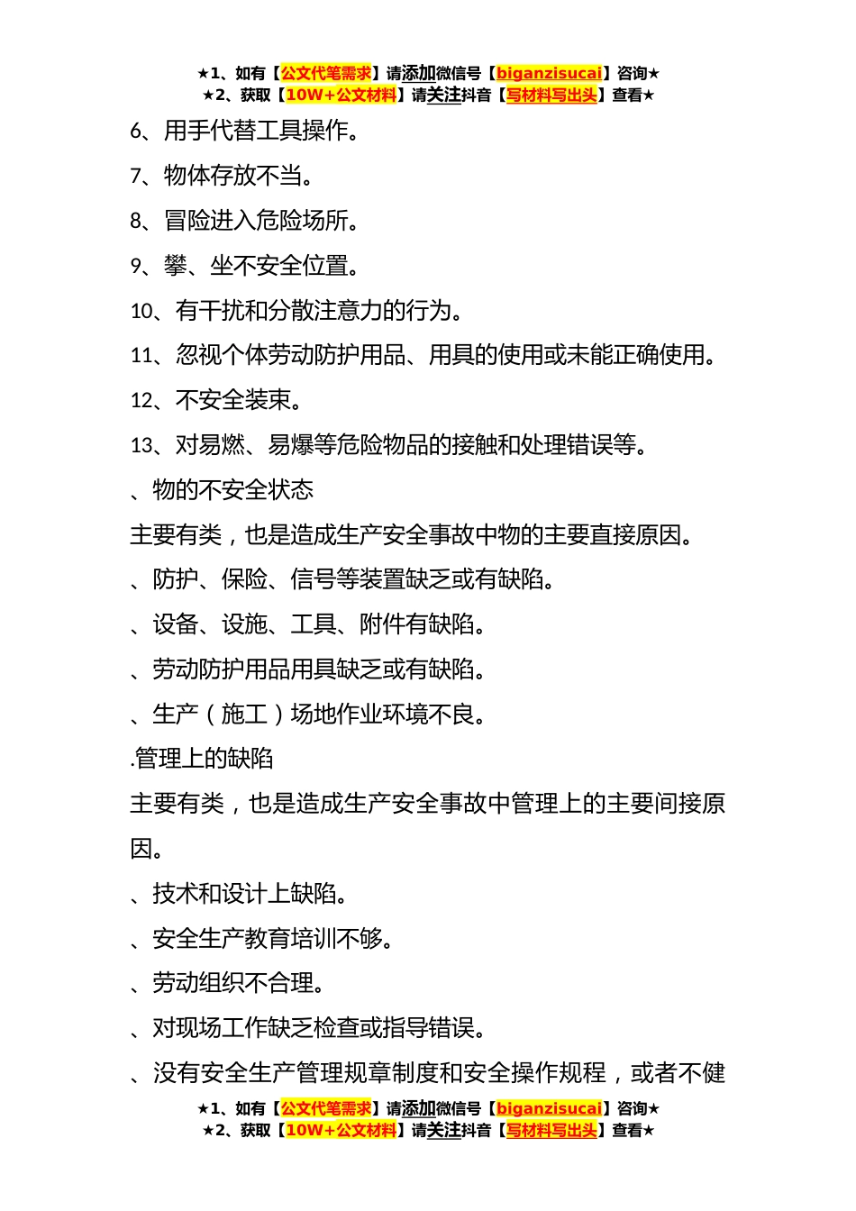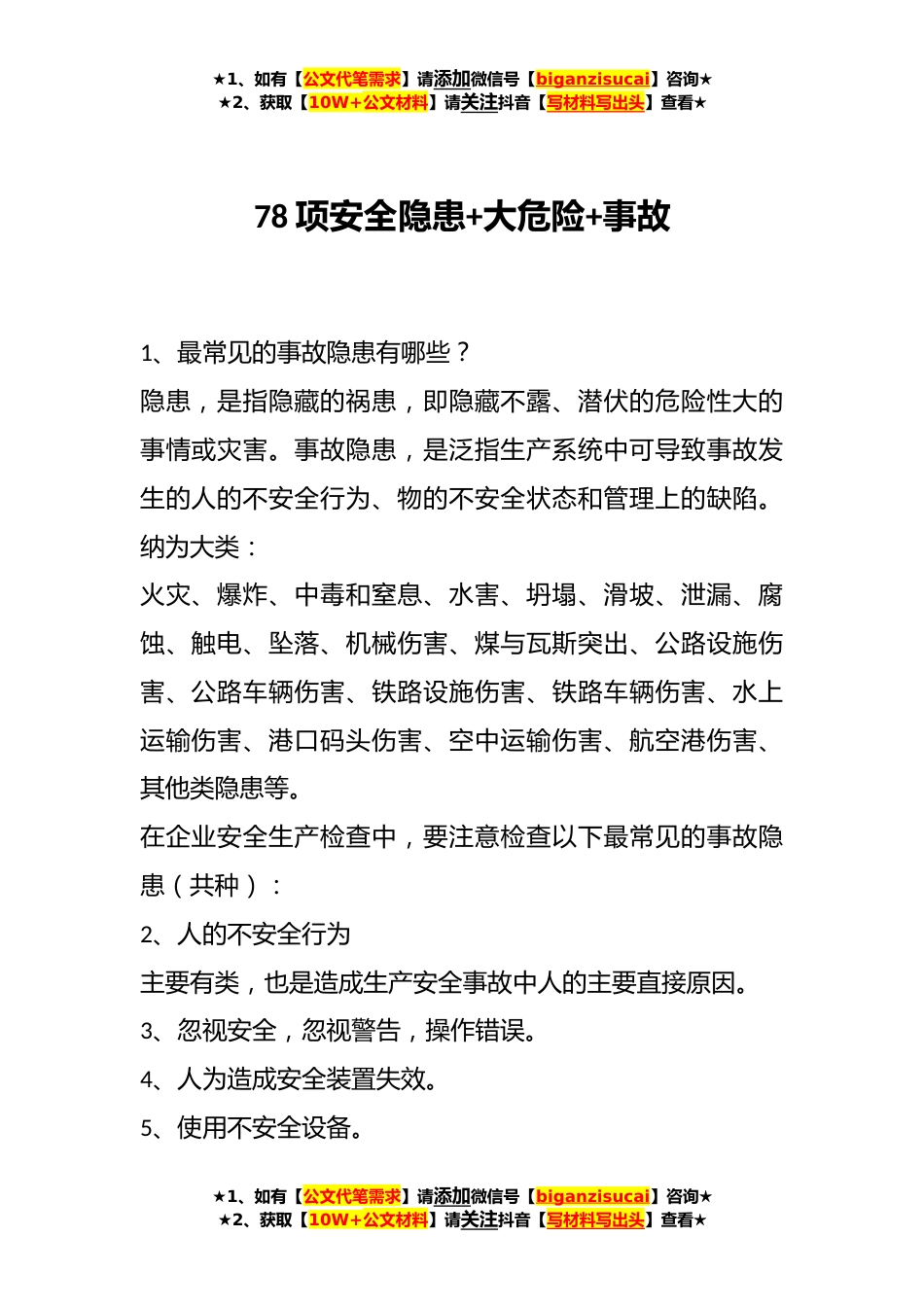 ★1、如有【公文代笔需求】请添加微信号【biganzisucai】咨询★★2、获取【10W+公文材料】请关注抖音【写材料写出头】查看★78项安全隐患+大危险+事故1、最常见的事故隐患有哪些?隐患,是指隐藏的祸患,即隐藏不露、潜伏的危险性大的事情或灾害。事故隐患,是泛指生产系统中可导致事故发生的人的不安全行为、物的不安全状态和管理上的缺陷。纳为大类:火灾、爆炸、中毒和窒息、水害、坍塌、滑坡、泄漏、腐蚀、触电、坠落、机械伤害、煤与瓦斯突出、公路设施伤害、公路车辆伤害、铁路设施伤害、铁路车辆伤害、水上运输伤害、港口码头伤害、空中运输伤害、航空港伤害、其他类隐患等。在企业安全生产检查中,要注意检查以下最常见的事故隐患(共种):2、人的不安全行为主要有类,也是造成生产安全事故中人的主要直...