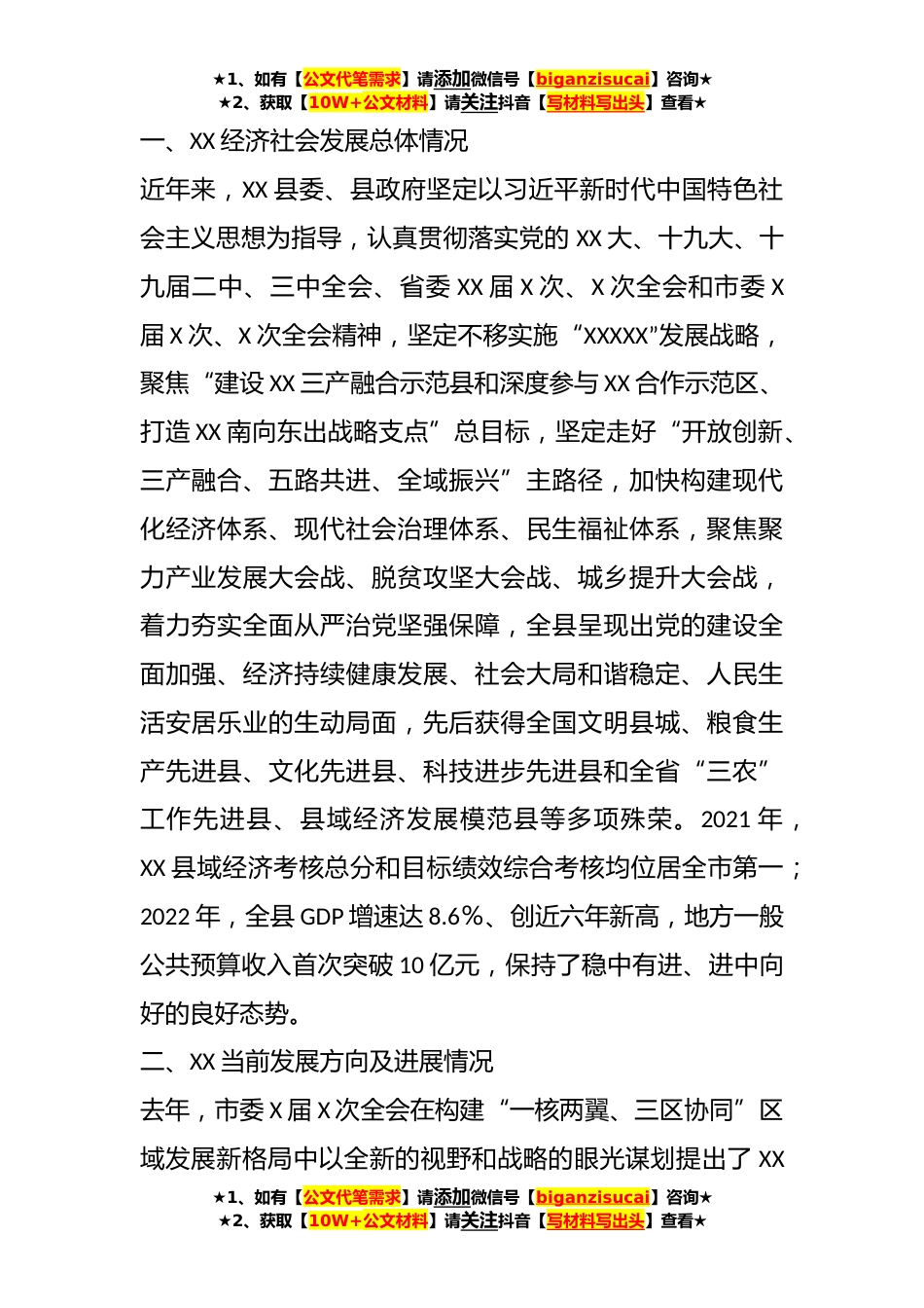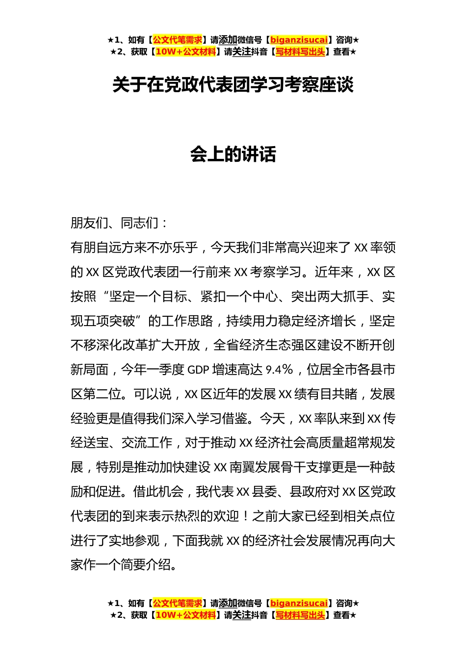 ★1、如有【公文代笔需求】请添加微信号【biganzisucai】咨询★★2、获取【10W+公文材料】请关注抖音【写材料写出头】查看★关于在党政代表团学习考察座谈会上的讲话朋友们、同志们:有朋自远方来不亦乐乎,今天我们非常高兴迎来了XX率领的XX区党政代表团一行前来XX考察学习。近年来,XX区按照“坚定一个目标、紧扣一个中心、突出两大抓手、实现五项突破”的工作思路,持续用力稳定经济增长,坚定不移深化改革扩大开放,全省经济生态强区建设不断开创新局面,今年一季度GDP增速高达9.4%,位居全市各县市区第二位。可以说,XX区近年的发展XX绩有目共睹,发展经验更是值得我们深入学习借鉴。今天,XX率队来到XX传经送宝、交流工作,对于推动XX经济社会高质量超常规发展,特别是推动加快建设XX南翼发展骨干支撑更是...