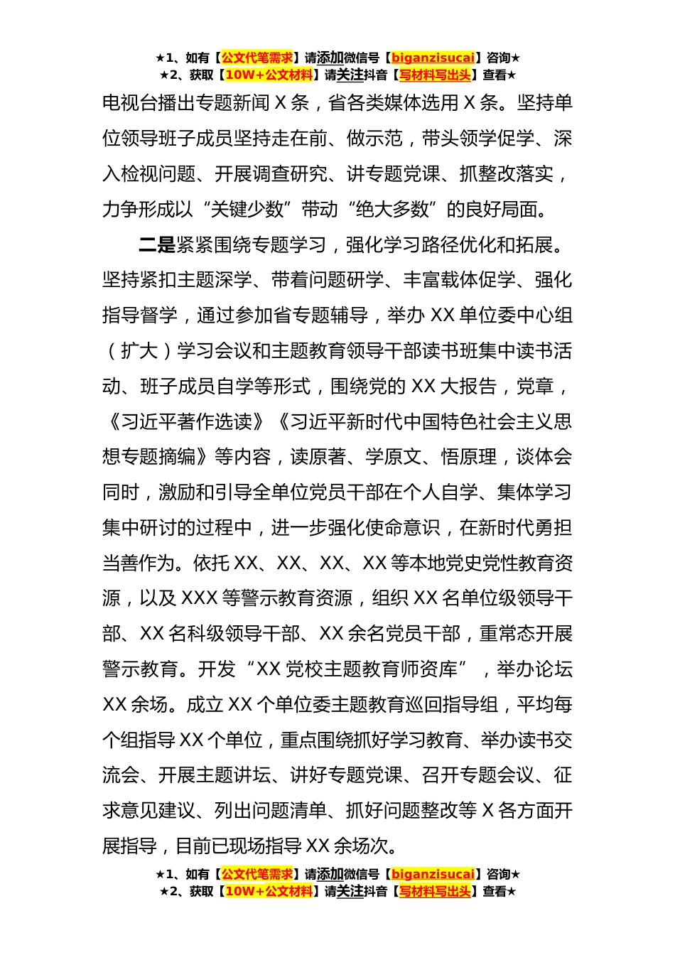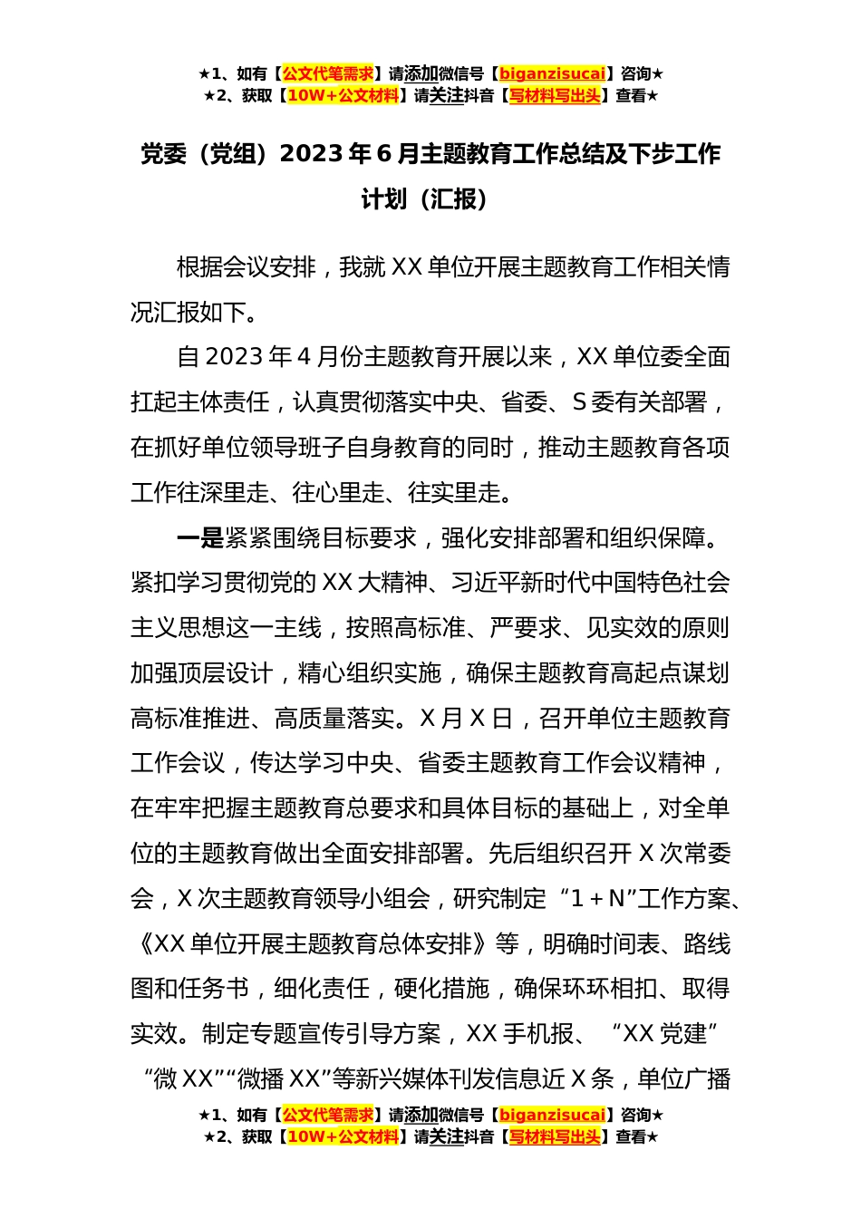 ★1、如有【公文代笔需求】请添加微信号【biganzisucai】咨询★★2、获取【10W+公文材料】请关注抖音【写材料写出头】查看★党委(党组)2023年6月主题教育工作总结及下步工作计划(汇报)根据会议安排,我就XX单位开展主题教育工作相关情况汇报如下。自2023年4月份主题教育开展以来,XX单位委全面扛起主体责任,认真贯彻落实中央、省委、S委有关部署,在抓好单位领导班子自身教育的同时,推动主题教育各项工作往深里走、往心里走、往实里走。一是紧紧围绕目标要求,强化安排部署和组织保障。紧扣学习贯彻党的XX大精神、习近平新时代中国特色社会主义思想这一主线,按照高标准、严要求、见实效的原则加强顶层设计,精心组织实施,确保主题教育高起点谋划高标准推进、高质量落实。X月X日,召开单位主题教育工作会议...