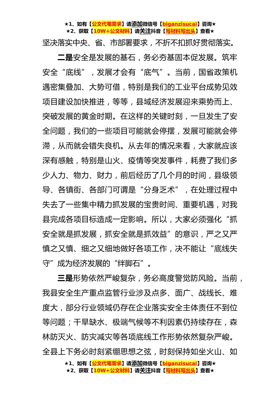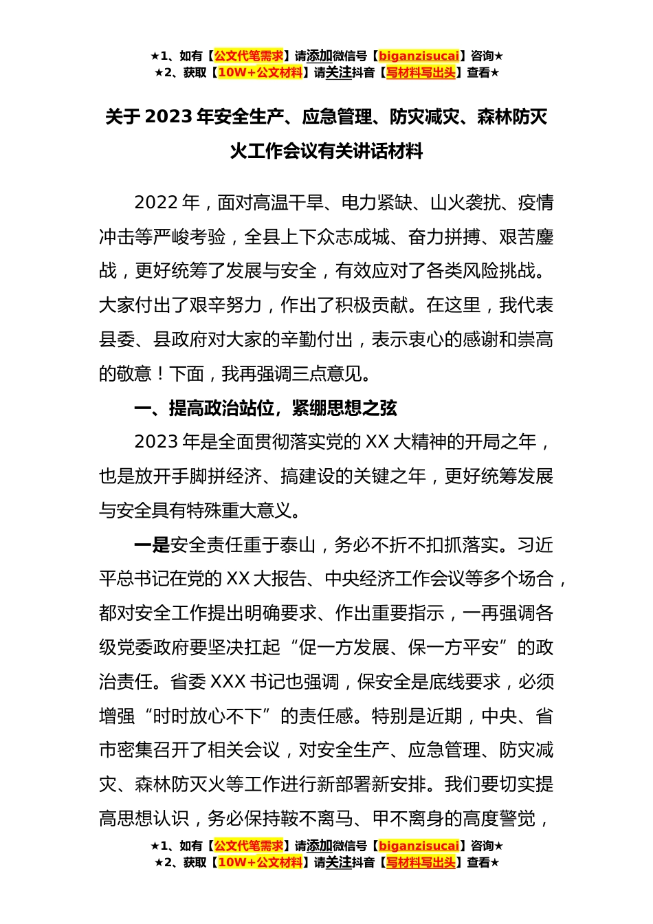 ★1、如有【公文代笔需求】请添加微信号【biganzisucai】咨询★★2、获取【10W+公文材料】请关注抖音【写材料写出头】查看★关于2023年安全生产、应急管理、防灾减灾、森林防灭火工作会议有关讲话材料2022年,面对高温干旱、电力紧缺、山火袭扰、疫情冲击等严峻考验,全县上下众志成城、奋力拼搏、艰苦鏖战,更好统筹了发展与安全,有效应对了各类风险挑战。大家付出了艰辛努力,作出了积极贡献。在这里,我代表县委、县政府对大家的辛勤付出,表示衷心的感谢和崇高的敬意!下面,我再强调三点意见。一、提高政治站位,紧绷思想之弦2023年是全面贯彻落实党的XX大精神的开局之年,也是放开手脚拼经济、搞建设的关键之年,更好统筹发展与安全具有特殊重大意义。一是安全责任重于泰山,务必不折不扣抓落实。习近平总...