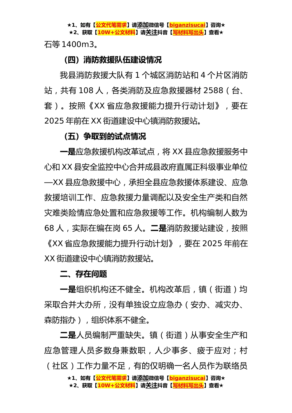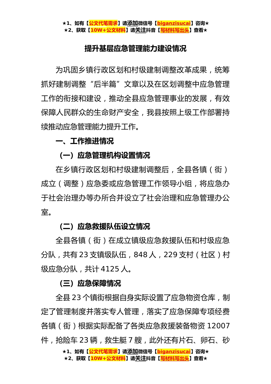 ★1、如有【公文代笔需求】请添加微信号【biganzisucai】咨询★★2、获取【10W+公文材料】请关注抖音【写材料写出头】查看★提升基层应急管理能力建设情况为巩固乡镇行政区划和村级建制调整改革成果,统筹抓好建制调整“后半篇”文章以及在区划调整中应急管理工作的衔接和建设,推动全县应急管理事业的发展,有效保障人民群众的生命财产安全,我县按照上级工作部署持续推动应急管理能力提升工作。一、工作推进情况(一)应急管理机构设置情况在乡镇行政区划和村级建制调整后,全县各镇(街)成立(调整)应急委或应急管理工作领导小组,将应急办于社会治理办等办所合并设立了社会治理和应急管理办公室。(二)应急救援队伍设立情况全县各镇(街)在成立镇级应急救援队伍和村级应急分队,共有23支镇级队伍,848人,...