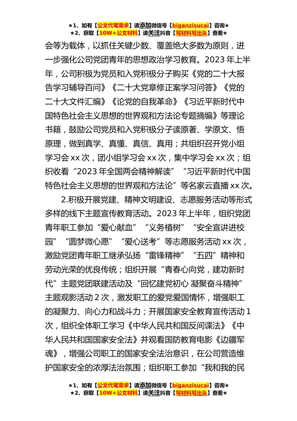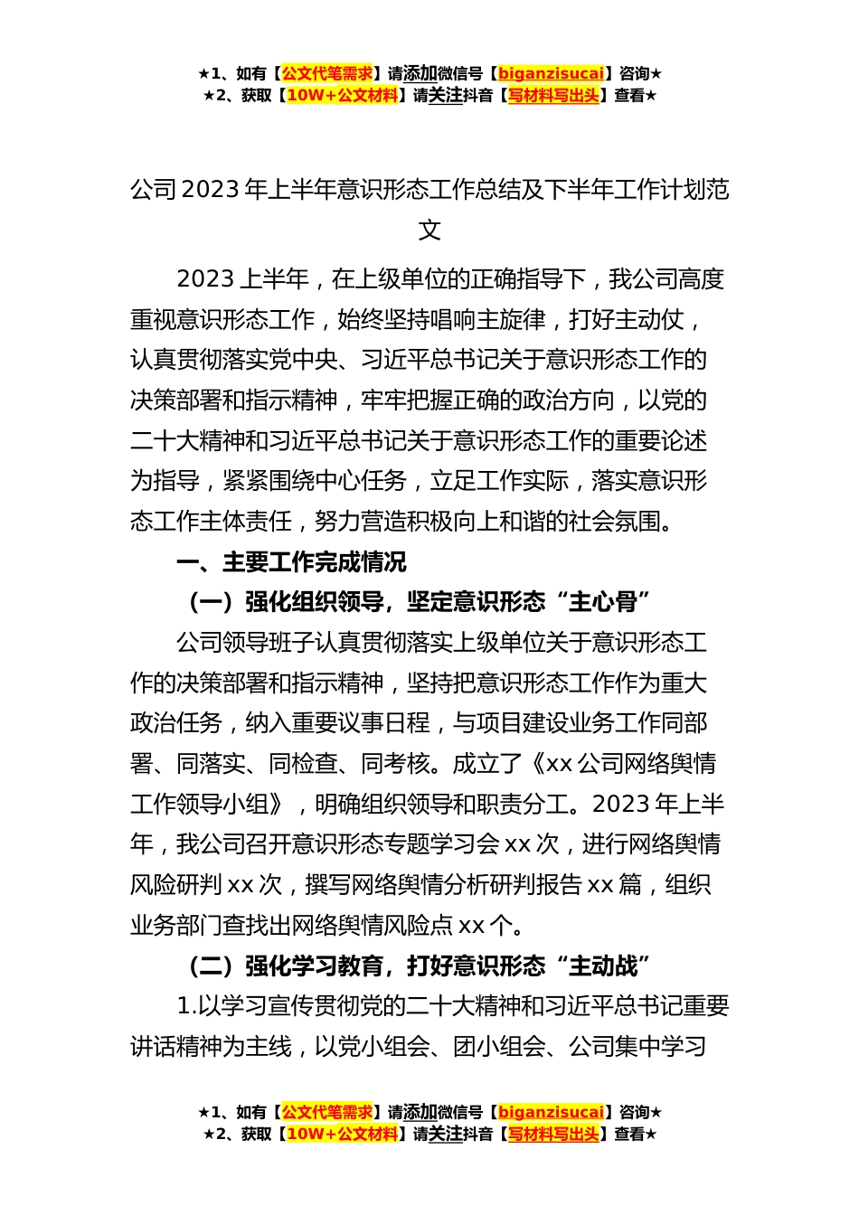 ★1、如有【公文代笔需求】请添加微信号【biganzisucai】咨询★★2、获取【10W+公文材料】请关注抖音【写材料写出头】查看★公司2023年上半年意识形态工作总结及下半年工作计划范文2023上半年,在上级单位的正确指导下,我公司高度重视意识形态工作,始终坚持唱响主旋律,打好主动仗,认真贯彻落实党中央、习近平总书记关于意识形态工作的决策部署和指示精神,牢牢把握正确的政治方向,以党的二十大精神和习近平总书记关于意识形态工作的重要论述为指导,紧紧围绕中心任务,立足工作实际,落实意识形态工作主体责任,努力营造积极向上和谐的社会氛围。一、主要工作完成情况(一)强化组织领导,坚定意识形态“主心骨”公司领导班子认真贯彻落实上级单位关于意识形态工作的决策部署和指示精神,坚持把意识形态工作...