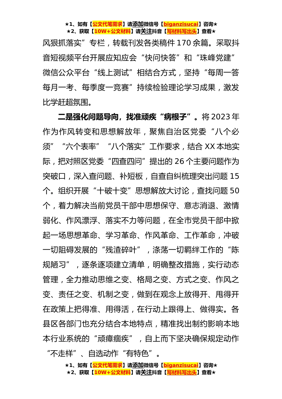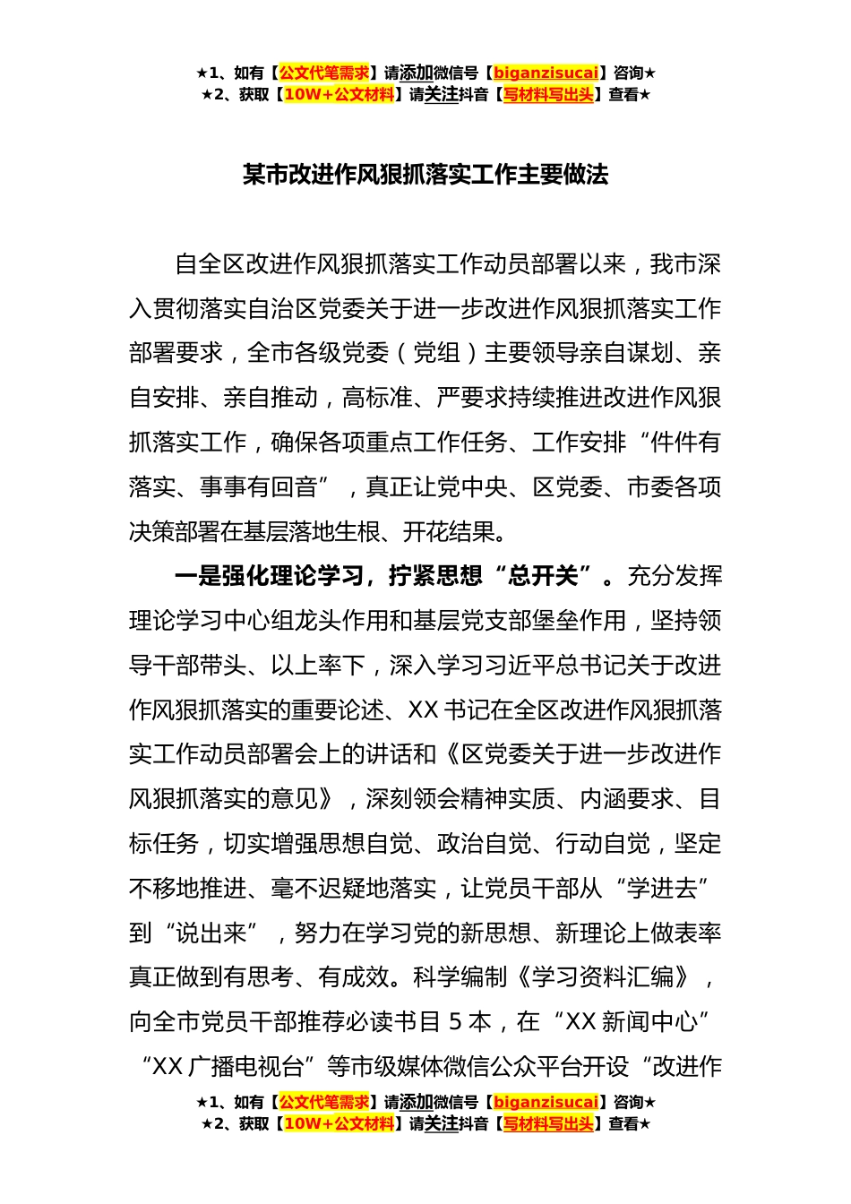 ★1、如有【公文代笔需求】请添加微信号【biganzisucai】咨询★★2、获取【10W+公文材料】请关注抖音【写材料写出头】查看★某市改进作风狠抓落实工作主要做法自全区改进作风狠抓落实工作动员部署以来,我市深入贯彻落实自治区党委关于进一步改进作风狠抓落实工作部署要求,全市各级党委(党组)主要领导亲自谋划、亲自安排、亲自推动,高标准、严要求持续推进改进作风狠抓落实工作,确保各项重点工作任务、工作安排“件件有落实、事事有回音”,真正让党中央、区党委、市委各项决策部署在基层落地生根、开花结果。一是强化理论学习,拧紧思想“总开关”。充分发挥理论学习中心组龙头作用和基层党支部堡垒作用,坚持领导干部带头、以上率下,深入学习习近平总书记关于改进作风狠抓落实的重要论述、XX书记在全区改...