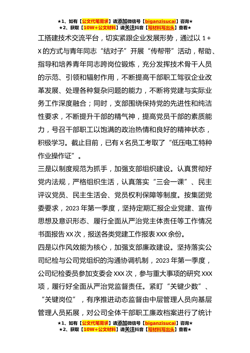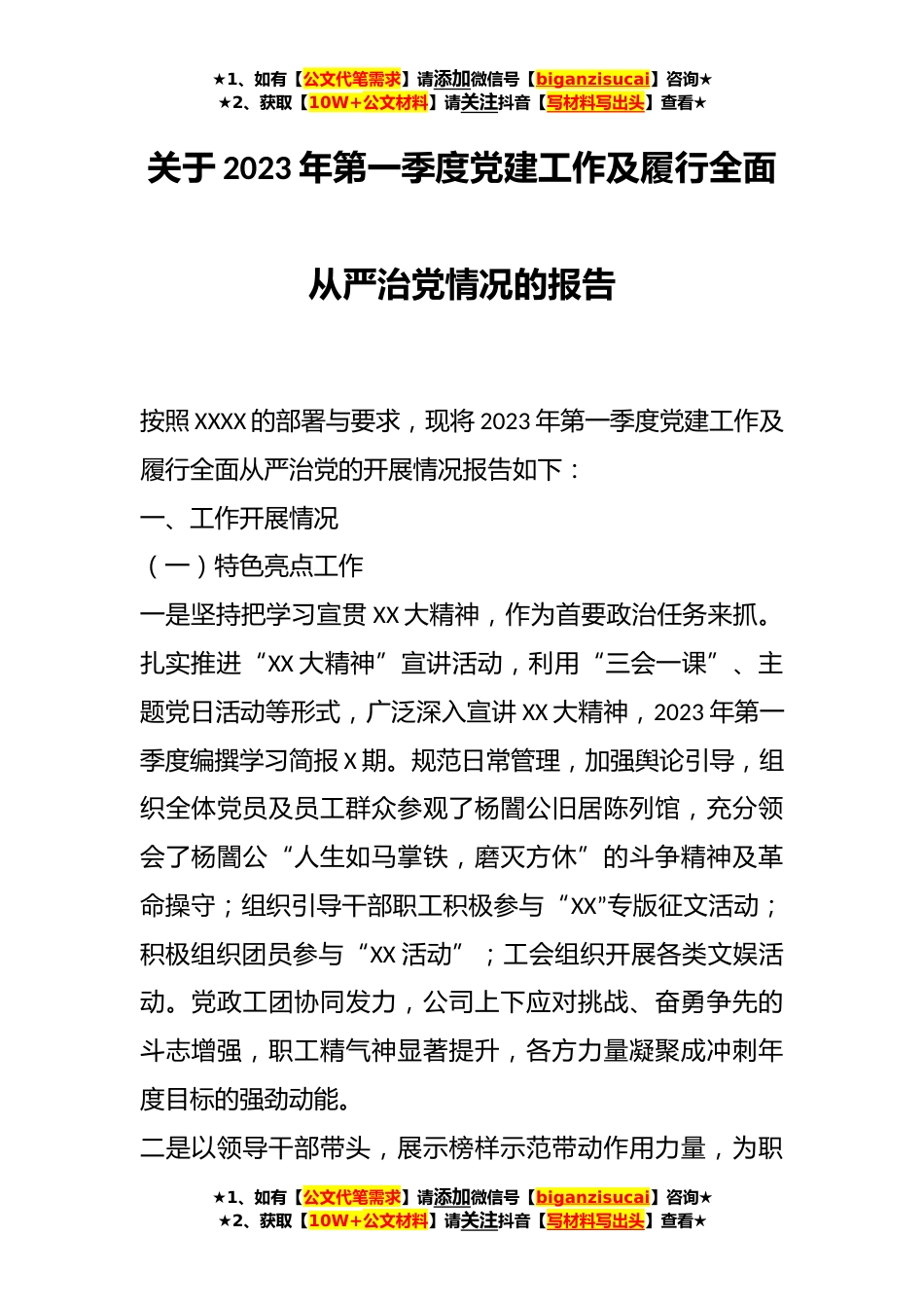 ★1、如有【公文代笔需求】请添加微信号【biganzisucai】咨询★★2、获取【10W+公文材料】请关注抖音【写材料写出头】查看★关于2023年第一季度党建工作及履行全面从严治党情况的报告按照XXXX的部署与要求,现将2023年第一季度党建工作及履行全面从严治党的开展情况报告如下:一、工作开展情况(一)特色亮点工作一是坚持把学习宣贯XX大精神,作为首要政治任务来抓。扎实推进“XX大精神”宣讲活动,利用“三会一课”、主题党日活动等形式,广泛深入宣讲XX大精神,2023年第一季度编撰学习简报X期。规范日常管理,加强舆论引导,组织全体党员及员工群众参观了杨闇公旧居陈列馆,充分领会了杨闇公“人生如马掌铁,磨灭方休”的斗争精神及革命操守;组织引导干部职工积极参与“XX”专版征文活动;积极组织团员参与“XX...
