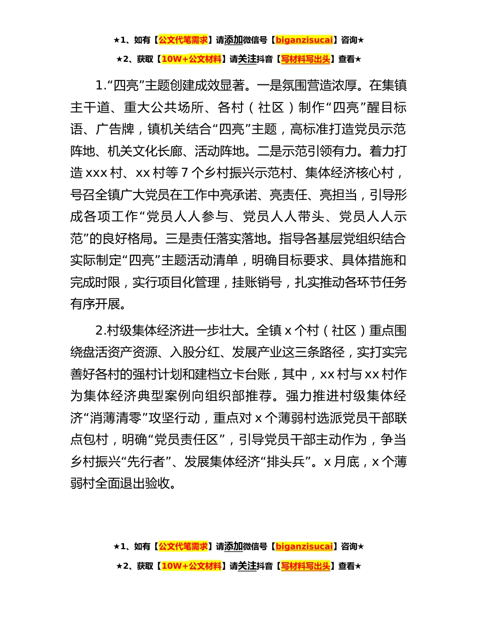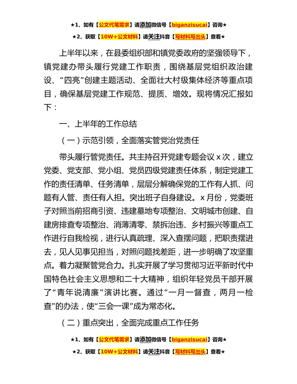 ★1、如有【公文代笔需求】请添加微信号【biganzisucai】咨询★★2、获取【10W+公文材料】请关注抖音【写材料写出头】查看★上半年以来,在县委组织部和镇党委政府的坚强领导下,镇党建办带头履行党建工作职责,围绕基层党组织政治建“”设、四亮创建主题活动、全面壮大村级集体经济等重点项目,确保基层党建工作规范、提质、增效。现将情况汇报如下:一、上半年的工作总结(一)示范引领,全面落实管党治党责任带头履行管党责任。共主持召开党建专题会议x次,建立党委、党支部、党小组、党员四级党建责任体系,制定党建工作的责任清单、任务清单,层层分解确保党的工作有人抓、问题有人管、责任有人担。突出班子自身建设。x月份,党委班子对照当前招商引资、违建墓地专项整治、文明城市创建、自建房排查专项整治...