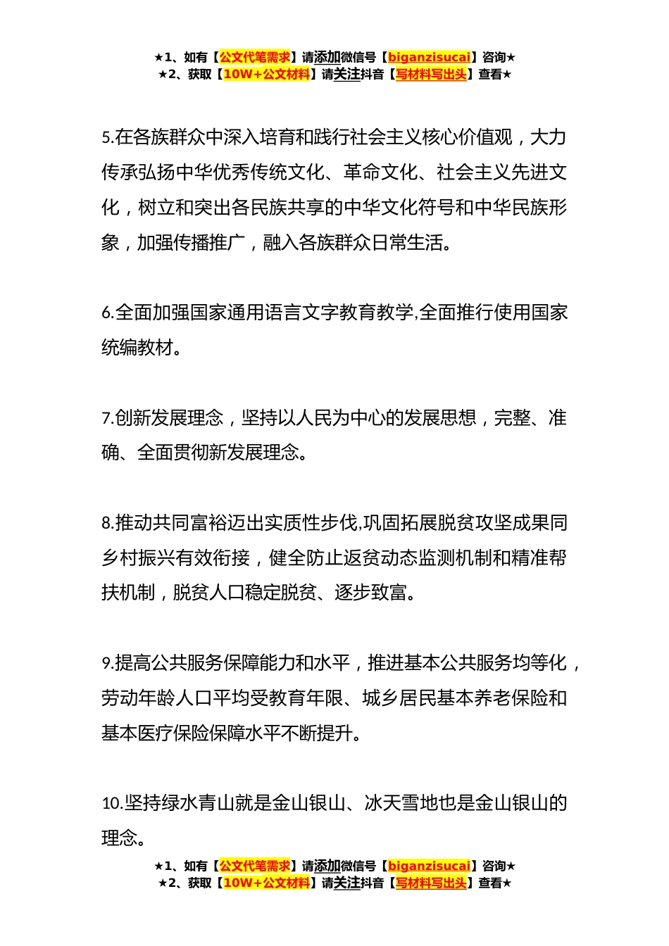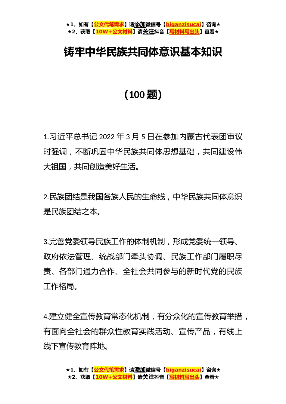 ★1、如有【公文代笔需求】请添加微信号【biganzisucai】咨询★★2、获取【10W+公文材料】请关注抖音【写材料写出头】查看★铸牢中华民族共同体意识基本知识(100题)1.习近平总书记2022年3月5日在参加内蒙古代表团审议时强调,不断巩固中华民族共同体思想基础,共同建设伟大祖国,共同创造美好生活。2.民族团结是我国各族人民的生命线,中华民族共同体意识是民族团结之本。3.完善党委领导民族工作的体制机制,形成党委统一领导、政府依法管理、统战部门牵头协调、民族工作部门履职尽责、各部门通力合作、全社会共同参与的新时代党的民族工作格局。4.建立健全宣传教育常态化机制,有分众化的宣传教育举措,有面向全社会的群众性教育实践活动、宣传产品,有线上线下宣传教育阵地。★1、如有【公文代笔需求】请添加...