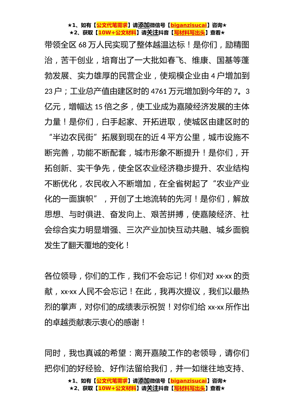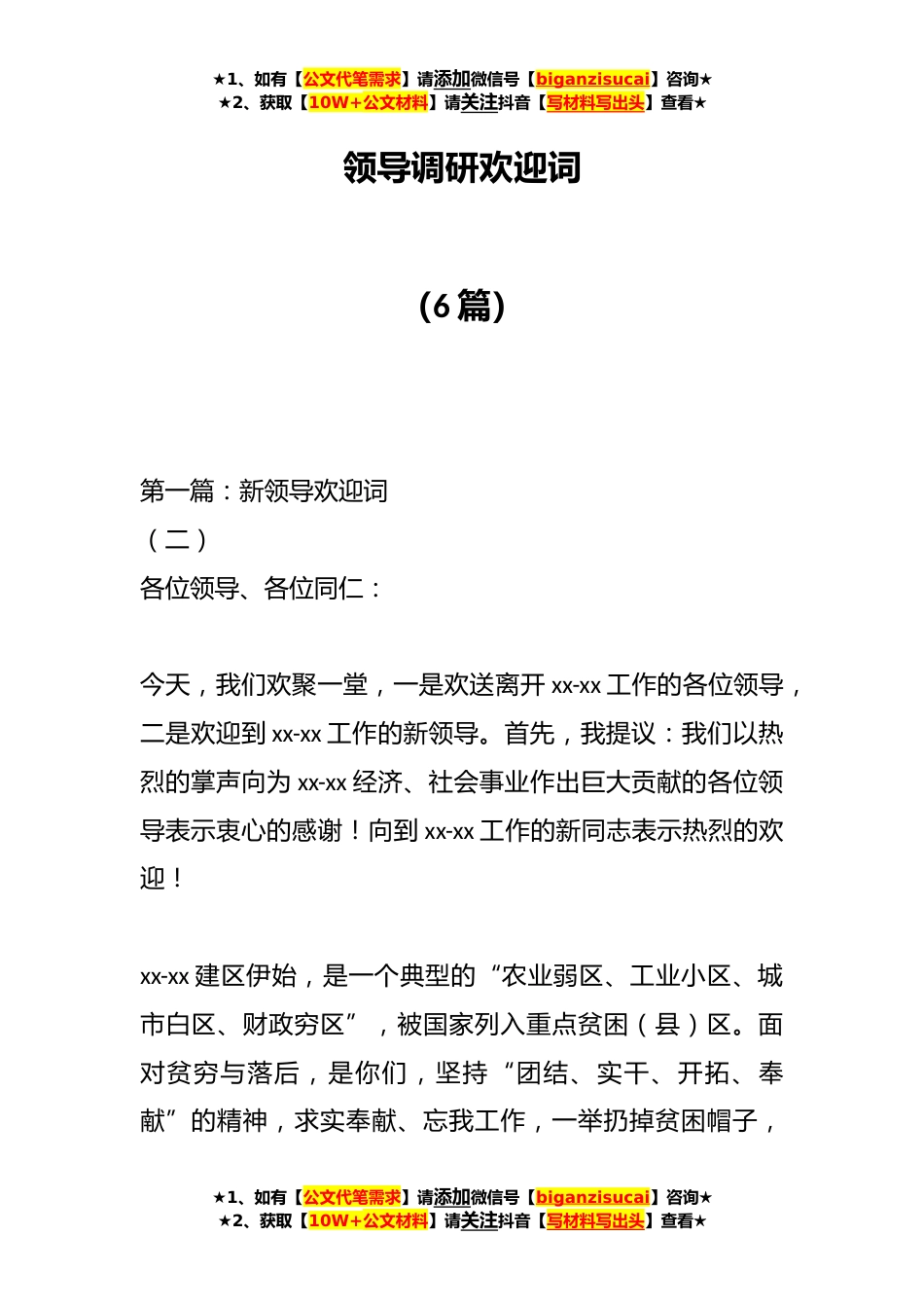 ★1、如有【公文代笔需求】请添加微信号【biganzisucai】咨询★★2、获取【10W+公文材料】请关注抖音【写材料写出头】查看★领导调研欢迎词(6篇)第一篇:新领导欢迎词(二)各位领导、各位同仁:今天,我们欢聚一堂,一是欢送离开xx-xx工作的各位领导,二是欢迎到xx-xx工作的新领导。首先,我提议:我们以热烈的掌声向为xx-xx经济、社会事业作出巨大贡献的各位领导表示衷心的感谢!向到xx-xx工作的新同志表示热烈的欢迎!xx-xx建区伊始,是一个典型的“农业弱区、工业小区、城市白区、财政穷区”,被国家列入重点贫困(县)区。面对贫穷与落后,是你们,坚持“团结、实干、开拓、奉献”的精神,求实奉献、忘我工作,一举扔掉贫困帽子,★1、如有【公文代笔需求】请添加微信号【biganzisucai】咨询★★2、获取【1...