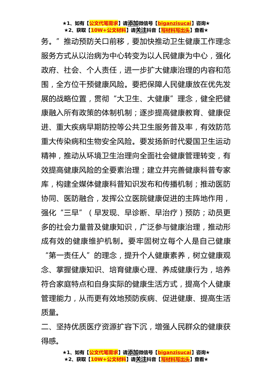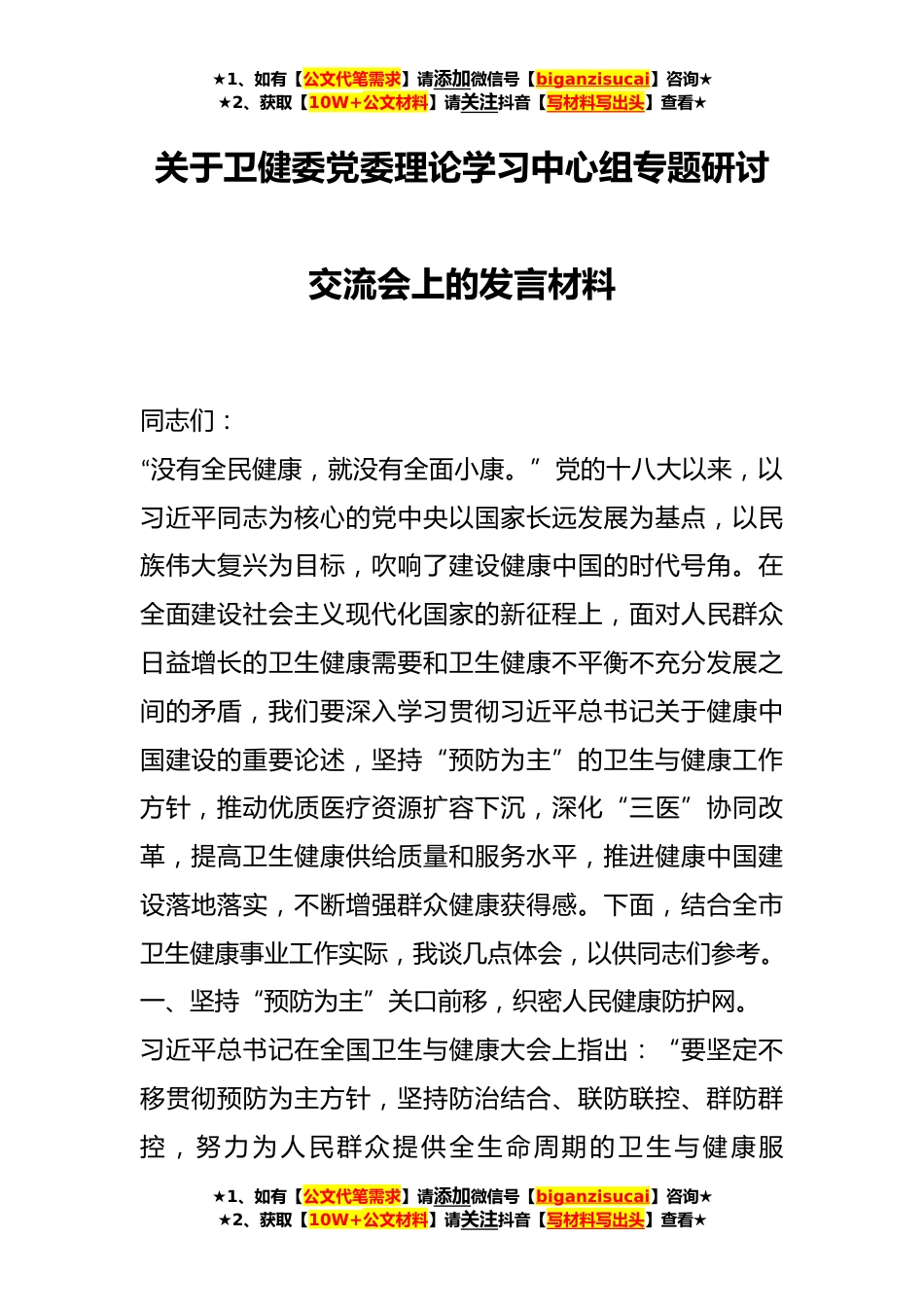 ★1、如有【公文代笔需求】请添加微信号【biganzisucai】咨询★★2、获取【10W+公文材料】请关注抖音【写材料写出头】查看★关于卫健委党委理论学习中心组专题研讨交流会上的发言材料同志们:“没有全民健康,就没有全面小康。”党的十八大以来,以习近平同志为核心的党中央以国家长远发展为基点,以民族伟大复兴为目标,吹响了建设健康中国的时代号角。在全面建设社会主义现代化国家的新征程上,面对人民群众日益增长的卫生健康需要和卫生健康不平衡不充分发展之间的矛盾,我们要深入学习贯彻习近平总书记关于健康中国建设的重要论述,坚持“预防为主”的卫生与健康工作方针,推动优质医疗资源扩容下沉,深化“三医”协同改革,提高卫生健康供给质量和服务水平,推进健康中国建设落地落实,不断增强群众健康获得...