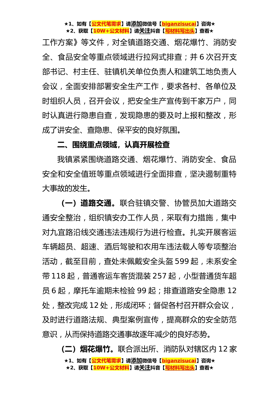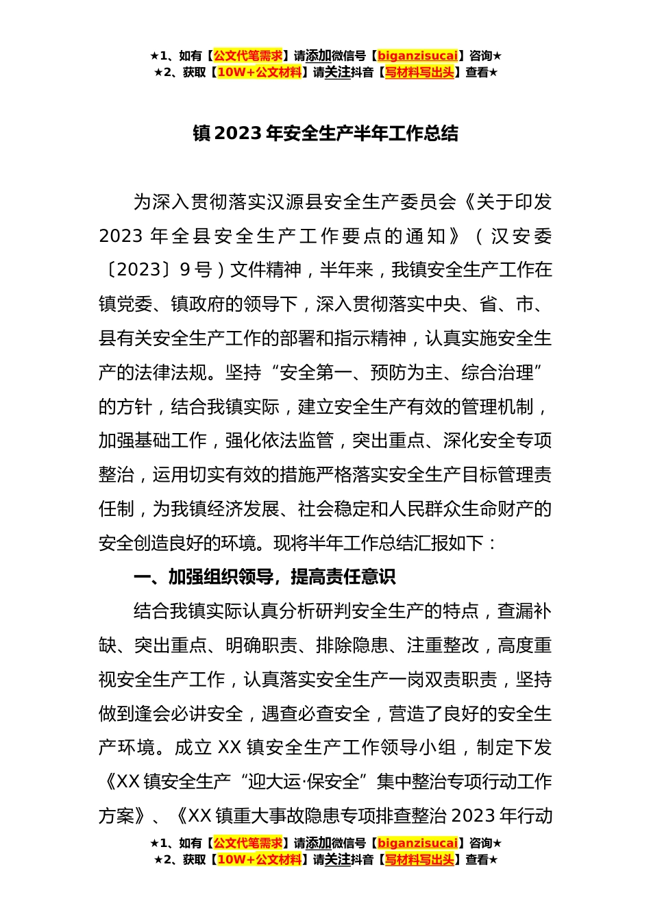 ★1、如有【公文代笔需求】请添加微信号【biganzisucai】咨询★★2、获取【10W+公文材料】请关注抖音【写材料写出头】查看★镇2023年安全生产半年工作总结为深入贯彻落实汉源县安全生产委员会《关于印发2023年全县安全生产工作要点的通知》(汉安委〔2023〕9号)文件精神,半年来,我镇安全生产工作在镇党委、镇政府的领导下,深入贯彻落实中央、省、市、县有关安全生产工作的部署和指示精神,认真实施安全生产的法律法规。坚持“安全第一、预防为主、综合治理”的方针,结合我镇实际,建立安全生产有效的管理机制,加强基础工作,强化依法监管,突出重点、深化安全专项整治,运用切实有效的措施严格落实安全生产目标管理责任制,为我镇经济发展、社会稳定和人民群众生命财产的安全创造良好的环境。现将半年工作总...