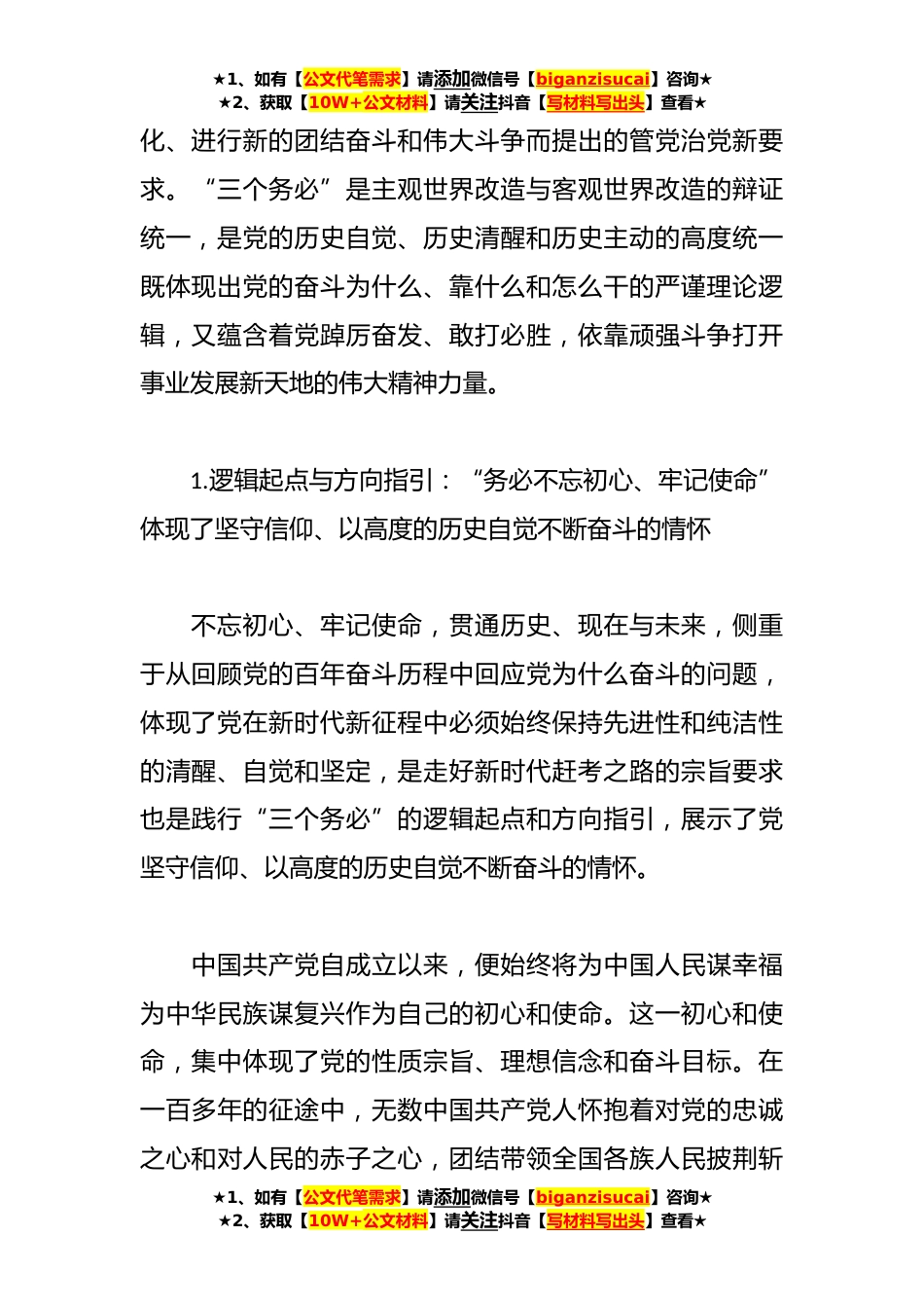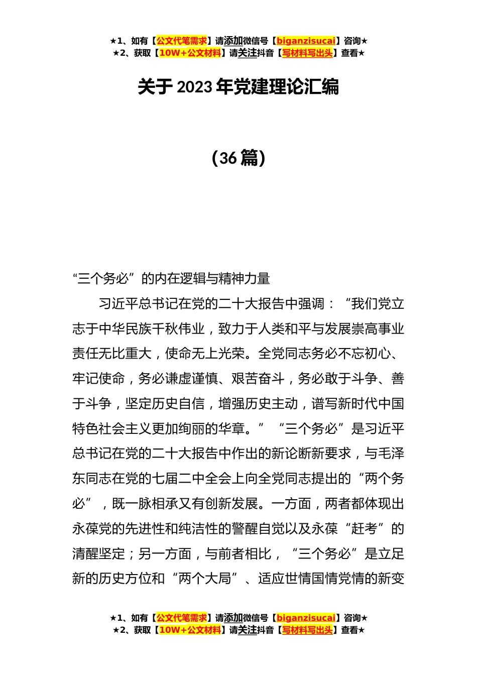 ★1、如有【公文代笔需求】请添加微信号【biganzisucai】咨询★★2、获取【10W+公文材料】请关注抖音【写材料写出头】查看★关于2023年党建理论汇编(36篇)“三个务必”的内在逻辑与精神力量习近平总书记在党的二十大报告中强调:“我们党立志于中华民族千秋伟业,致力于人类和平与发展崇高事业责任无比重大,使命无上光荣。全党同志务必不忘初心、牢记使命,务必谦虚谨慎、艰苦奋斗,务必敢于斗争、善于斗争,坚定历史自信,增强历史主动,谱写新时代中国特色社会主义更加绚丽的华章。”“三个务必”是习近平总书记在党的二十大报告中作出的新论断新要求,与毛泽东同志在党的七届二中全会上向全党同志提出的“两个务必”,既一脉相承又有创新发展。一方面,两者都体现出永葆党的先进性和纯洁性的警醒自觉以及永...