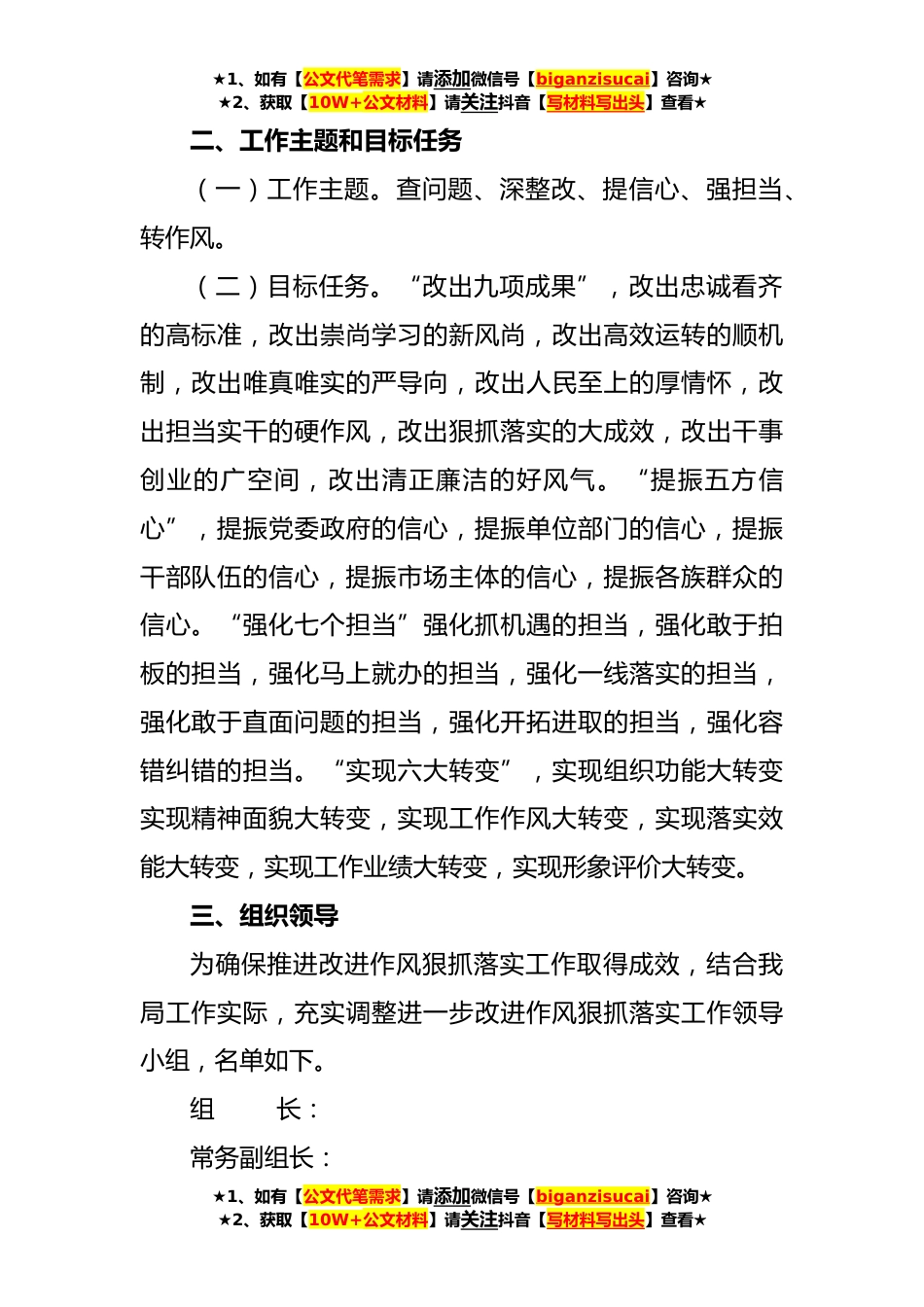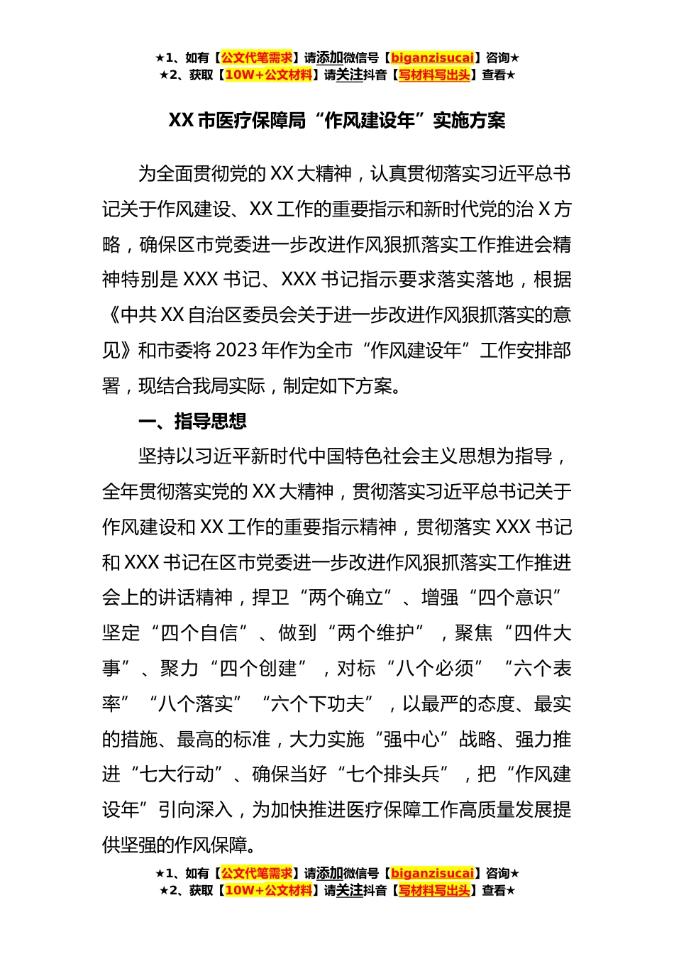 ★1、如有【公文代笔需求】请添加微信号【biganzisucai】咨询★★2、获取【10W+公文材料】请关注抖音【写材料写出头】查看★XX市医疗保障局“作风建设年”实施方案为全面贯彻党的XX大精神,认真贯彻落实习近平总书记关于作风建设、XX工作的重要指示和新时代党的治X方略,确保区市党委进一步改进作风狠抓落实工作推进会精神特别是XXX书记、XXX书记指示要求落实落地,根据《中共XX自治区委员会关于进一步改进作风狠抓落实的意见》和市委将2023年作为全市“作风建设年”工作安排部署,现结合我局实际,制定如下方案。一、指导思想坚持以习近平新时代中国特色社会主义思想为指导,全年贯彻落实党的XX大精神,贯彻落实习近平总书记关于作风建设和XX工作的重要指示精神,贯彻落实XXX书记和XXX书记在区市党委进一步改进作...