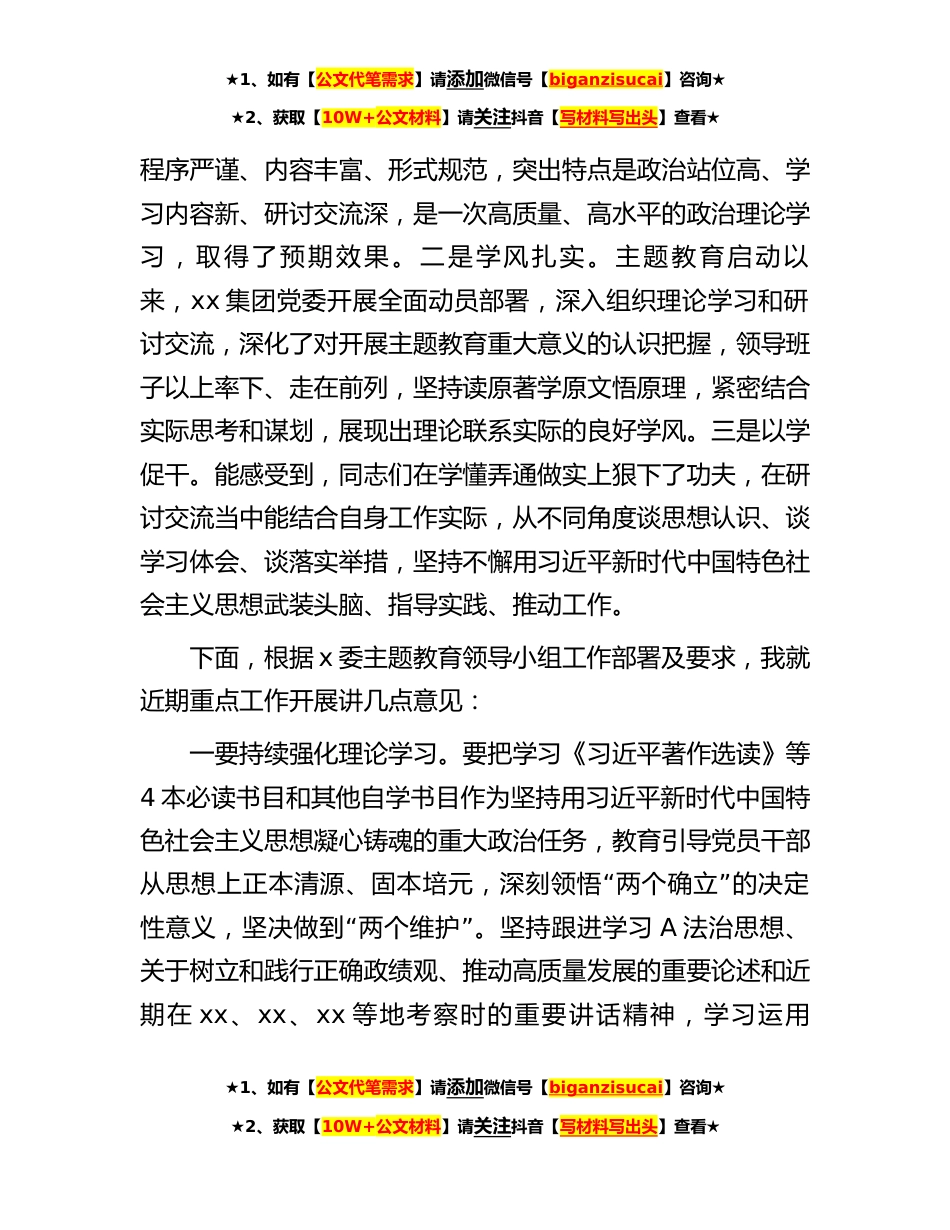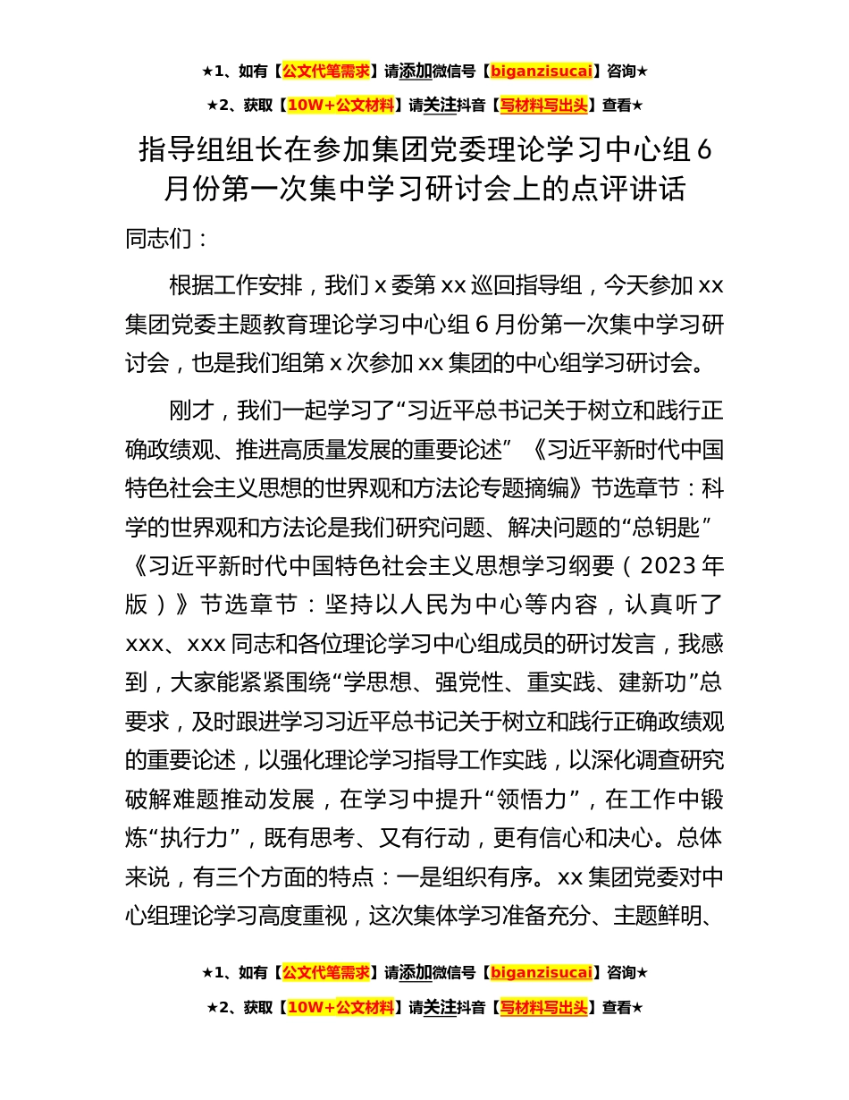 ★1、如有【公文代笔需求】请添加微信号【biganzisucai】咨询★★2、获取【10W+公文材料】请关注抖音【写材料写出头】查看★指导组组长在参加集团党委理论学习中心组6月份第一次集中学习研讨会上的点评讲话同志们:根据工作安排,我们x委第xx巡回指导组,今天参加xx集团党委主题教育理论学习中心组6月份第一次集中学习研讨会,也是我们组第x次参加xx集团的中心组学习研讨会。“刚才,我们一起学习了习近平总书记关于树立和践行正确政绩观、推进高质量发展的重要论述”《习近平新时代中国特色社会主义思想的世界观和方法论专题摘编》节选章节:科“学的世界观和方法论是我们研究问题、解决问题的总钥匙”《习近平新时代中国特色社会主义思想学习纲要(2023年版)》节选章节:坚持以人民为中心等内容,认真听了xxx、...