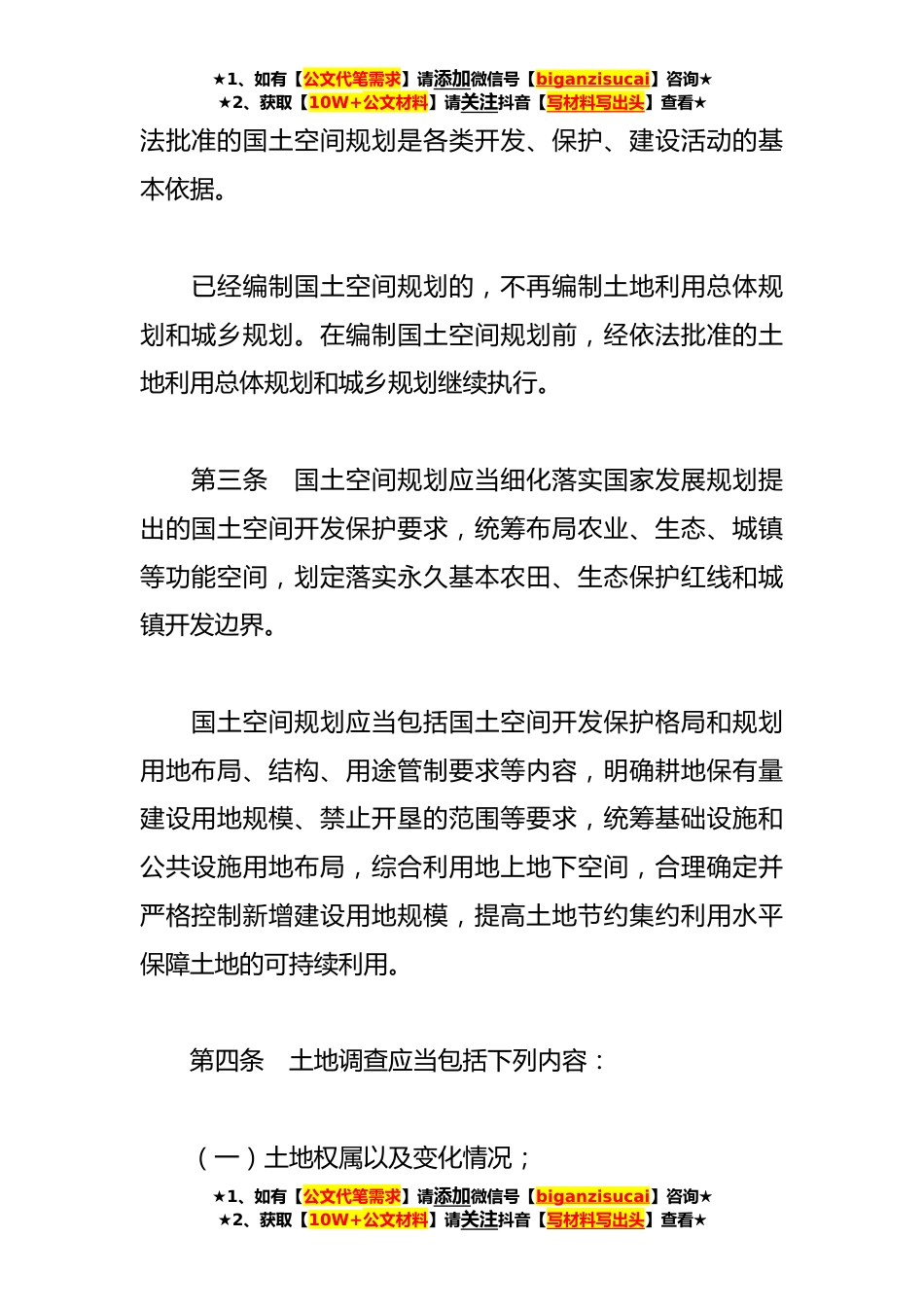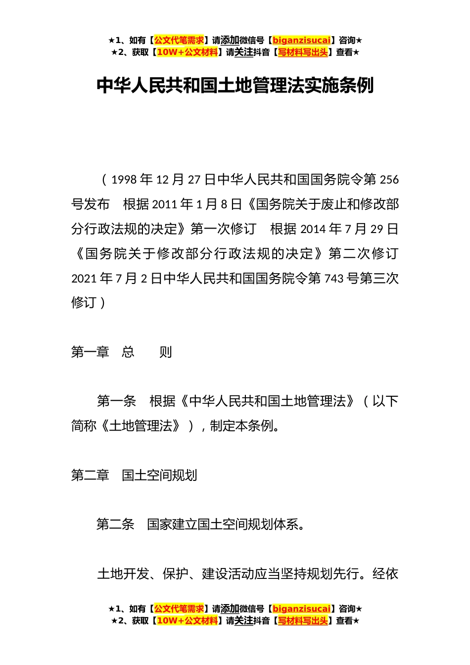 ★1、如有【公文代笔需求】请添加微信号【biganzisucai】咨询★★2、获取【10W+公文材料】请关注抖音【写材料写出头】查看★中华人民共和国土地管理法实施条例(1998年12月27日中华人民共和国国务院令第256号发布根据2011年1月8日《国务院关于废止和修改部分行政法规的决定》第一次修订根据2014年7月29日《国务院关于修改部分行政法规的决定》第二次修订2021年7月2日中华人民共和国国务院令第743号第三次修订)第一章总则第一条根据《中华人民共和国土地管理法》(以下简称《土地管理法》),制定本条例。第二章国土空间规划第二条国家建立国土空间规划体系。土地开发、保护、建设活动应当坚持规划先行。经依★1、如有【公文代笔需求】请添加微信号【biganzisucai】咨询★★2、获取【10W+公文材料】请关注抖音【写...