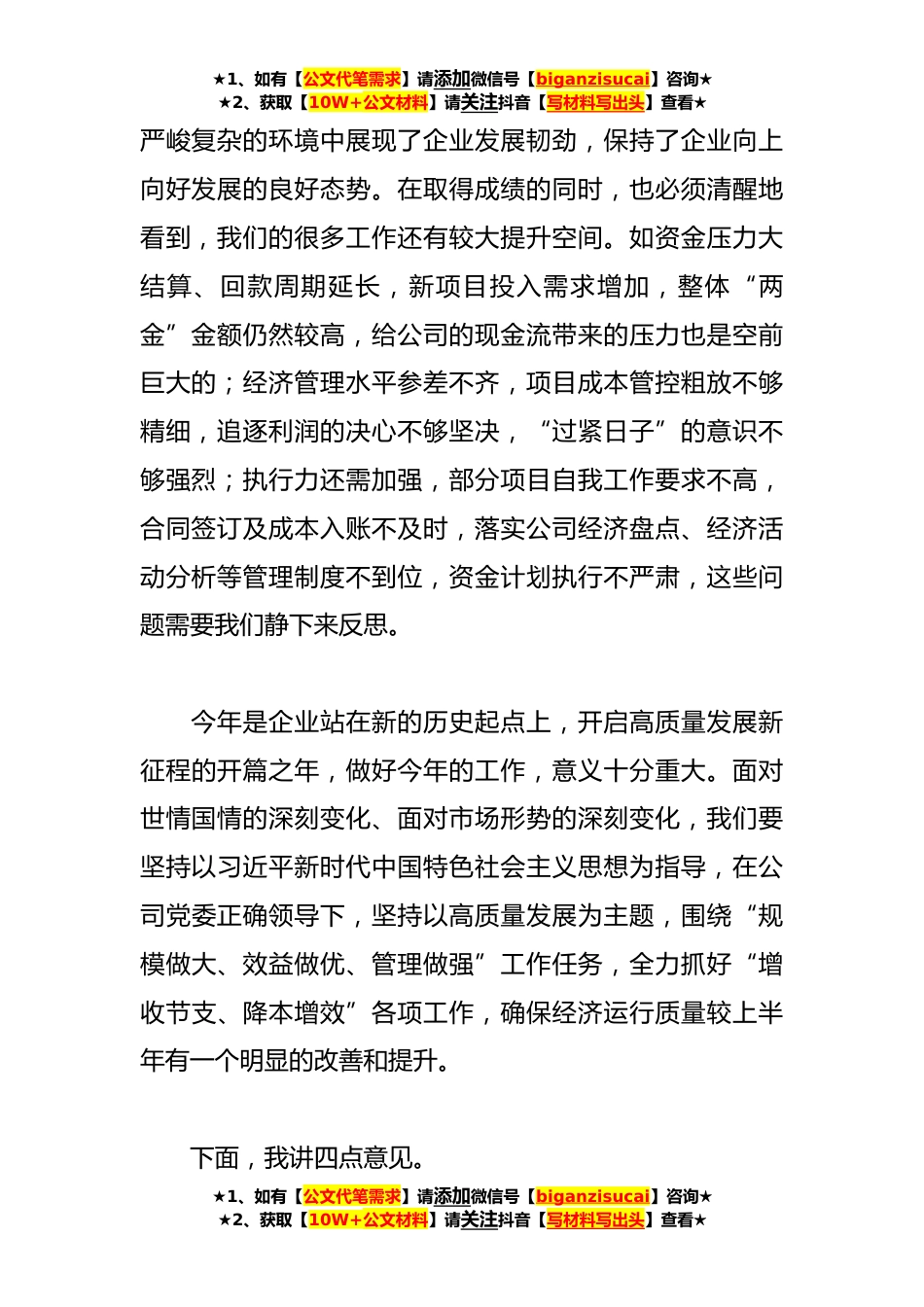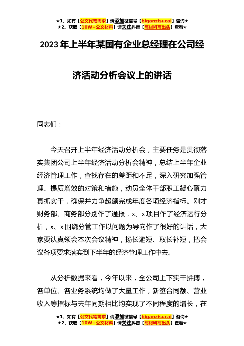 ★1、如有【公文代笔需求】请添加微信号【biganzisucai】咨询★★2、获取【10W+公文材料】请关注抖音【写材料写出头】查看★2023年上半年某国有企业总经理在公司经济活动分析会议上的讲话同志们:今天召开上半年经济活动分析会,主要任务是贯彻落实集团公司上半年经济活动分析会精神,总结上半年企业经济管理工作,查找存在的差距和不足,深入研究加强管理、提质增效的对策和措施,动员全体干部职工凝心聚力真抓实干,确保并力争超额完成年度各项经济指标。刚才财务部、商务部分别作了通报,x、x项目作了经济运行分析,x、x围绕分管工作以问题为导向作了很好的讲话,大家要认真领会本次会议精神,扬长避短、取长补短,把会议各项要求落实到下半年的经济管理工作中去。从分析数据来看,今年以来,全公司上下实干拼...