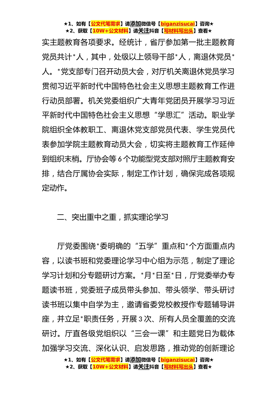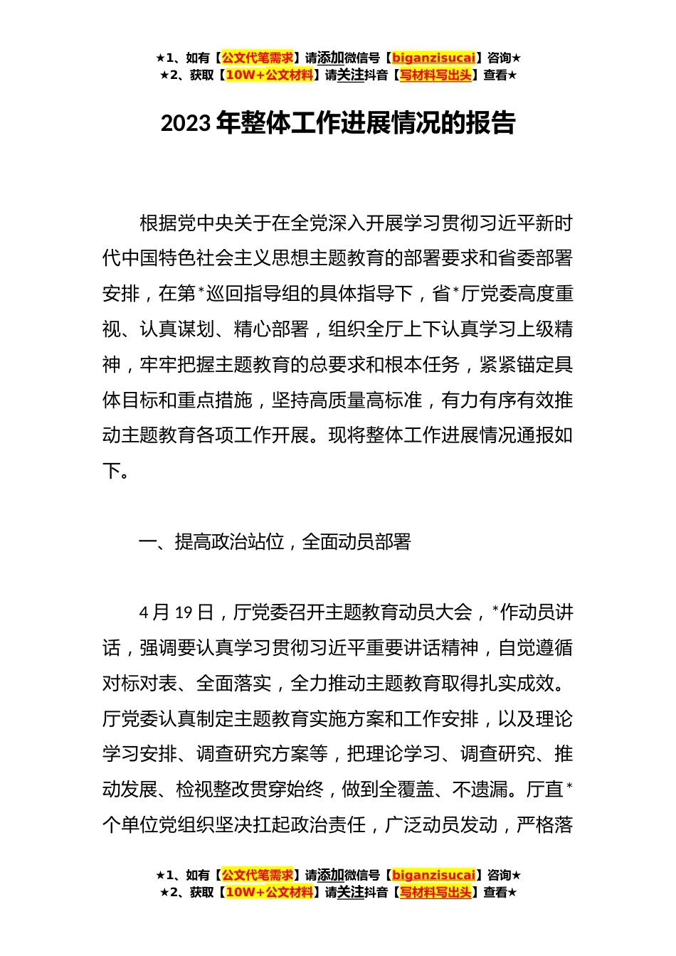 ★1、如有【公文代笔需求】请添加微信号【biganzisucai】咨询★★2、获取【10W+公文材料】请关注抖音【写材料写出头】查看★2023年整体工作进展情况的报告根据党中央关于在全党深入开展学习贯彻习近平新时代中国特色社会主义思想主题教育的部署要求和省委部署安排,在第*巡回指导组的具体指导下,省*厅党委高度重视、认真谋划、精心部署,组织全厅上下认真学习上级精神,牢牢把握主题教育的总要求和根本任务,紧紧锚定具体目标和重点措施,坚持高质量高标准,有力有序有效推动主题教育各项工作开展。现将整体工作进展情况通报如下。一、提高政治站位,全面动员部署4月19日,厅党委召开主题教育动员大会,*作动员讲话,强调要认真学习贯彻习近平重要讲话精神,自觉遵循对标对表、全面落实,全力推动主题教育取得扎...