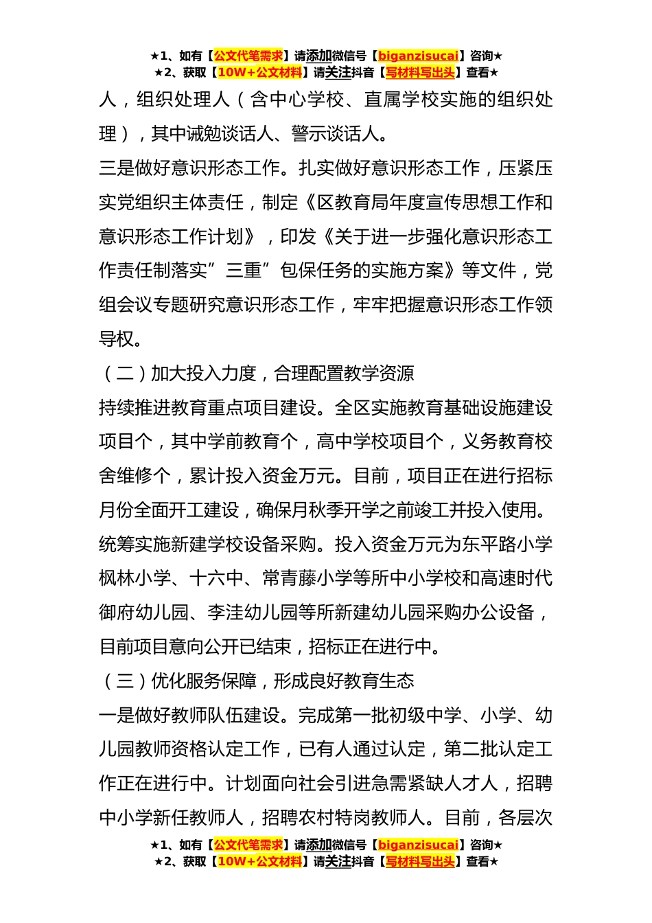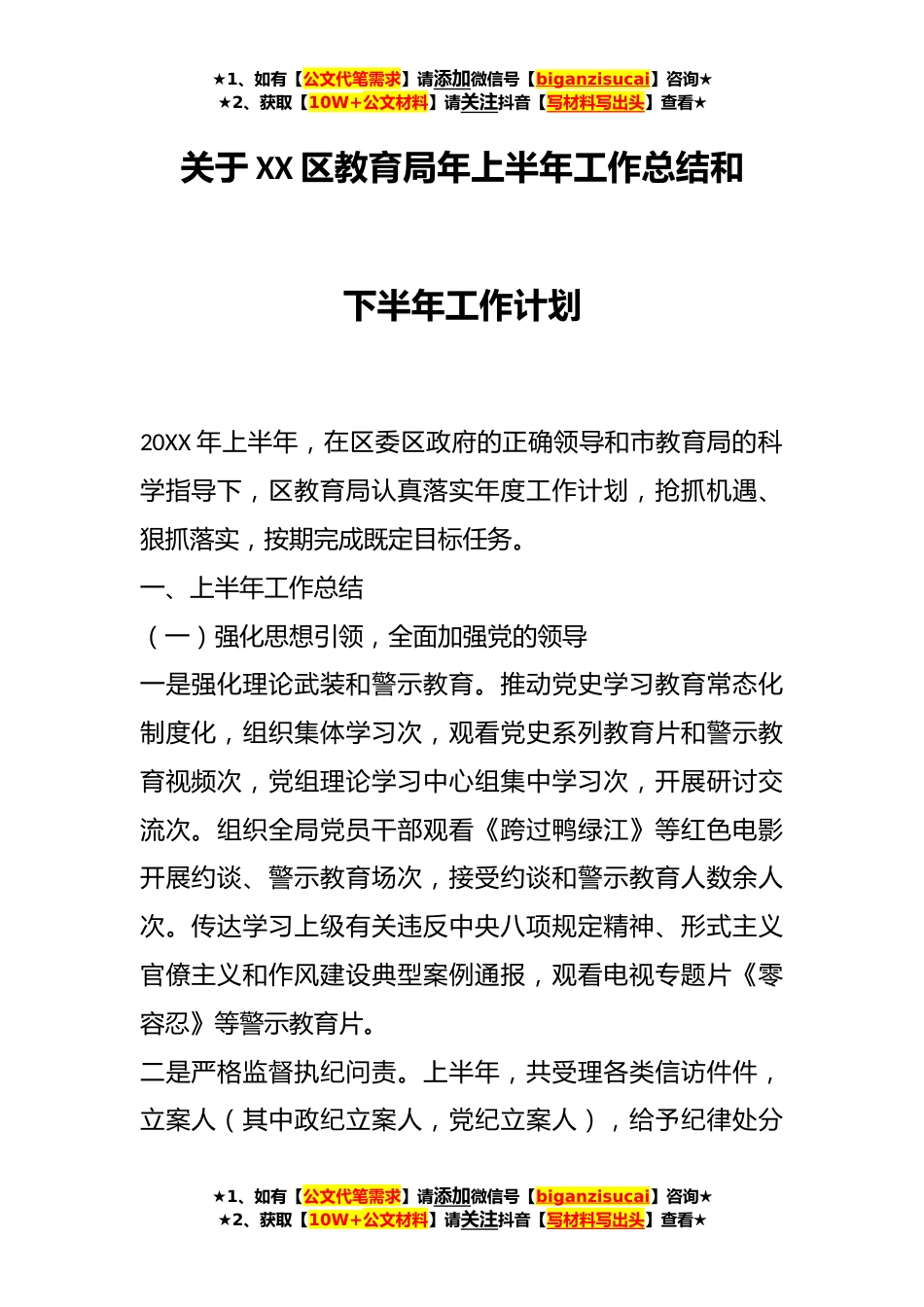 ★1、如有【公文代笔需求】请添加微信号【biganzisucai】咨询★★2、获取【10W+公文材料】请关注抖音【写材料写出头】查看★关于XX区教育局年上半年工作总结和下半年工作计划20XX年上半年,在区委区政府的正确领导和市教育局的科学指导下,区教育局认真落实年度工作计划,抢抓机遇、狠抓落实,按期完成既定目标任务。一、上半年工作总结(一)强化思想引领,全面加强党的领导一是强化理论武装和警示教育。推动党史学习教育常态化制度化,组织集体学习次,观看党史系列教育片和警示教育视频次,党组理论学习中心组集中学习次,开展研讨交流次。组织全局党员干部观看《跨过鸭绿江》等红色电影开展约谈、警示教育场次,接受约谈和警示教育人数余人次。传达学习上级有关违反中央八项规定精神、形式主义官僚主义和作风...