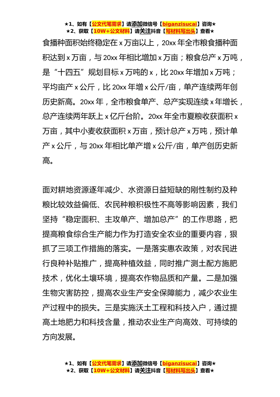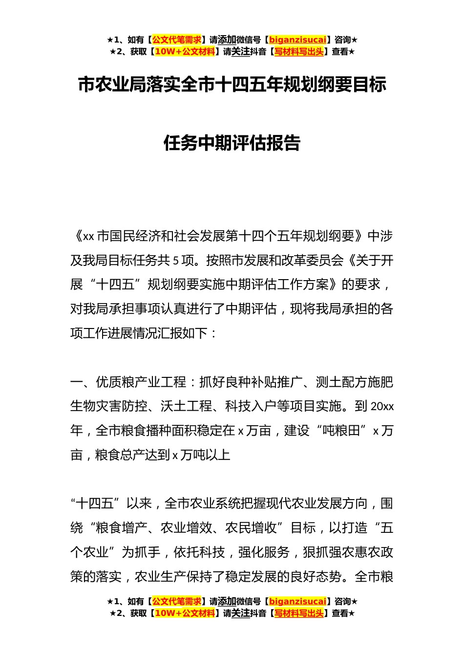★1、如有【公文代笔需求】请添加微信号【biganzisucai】咨询★★2、获取【10W+公文材料】请关注抖音【写材料写出头】查看★市农业局落实全市十四五年规划纲要目标任务中期评估报告《xx市国民经济和社会发展第十四个五年规划纲要》中涉及我局目标任务共5项。按照市发展和改革委员会《关于开展“十四五”规划纲要实施中期评估工作方案》的要求,对我局承担事项认真进行了中期评估,现将我局承担的各项工作进展情况汇报如下:一、优质粮产业工程:抓好良种补贴推广、测土配方施肥生物灾害防控、沃土工程、科技入户等项目实施。到20xx年,全市粮食播种面积稳定在x万亩,建设“吨粮田”x万亩,粮食总产达到x万吨以上“十四五”以来,全市农业系统把握现代农业发展方向,围绕“粮食增产、农业增效、农民增收”目标,以...