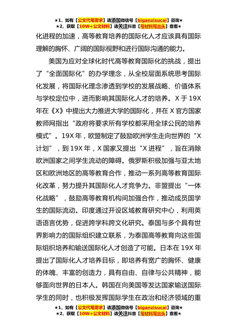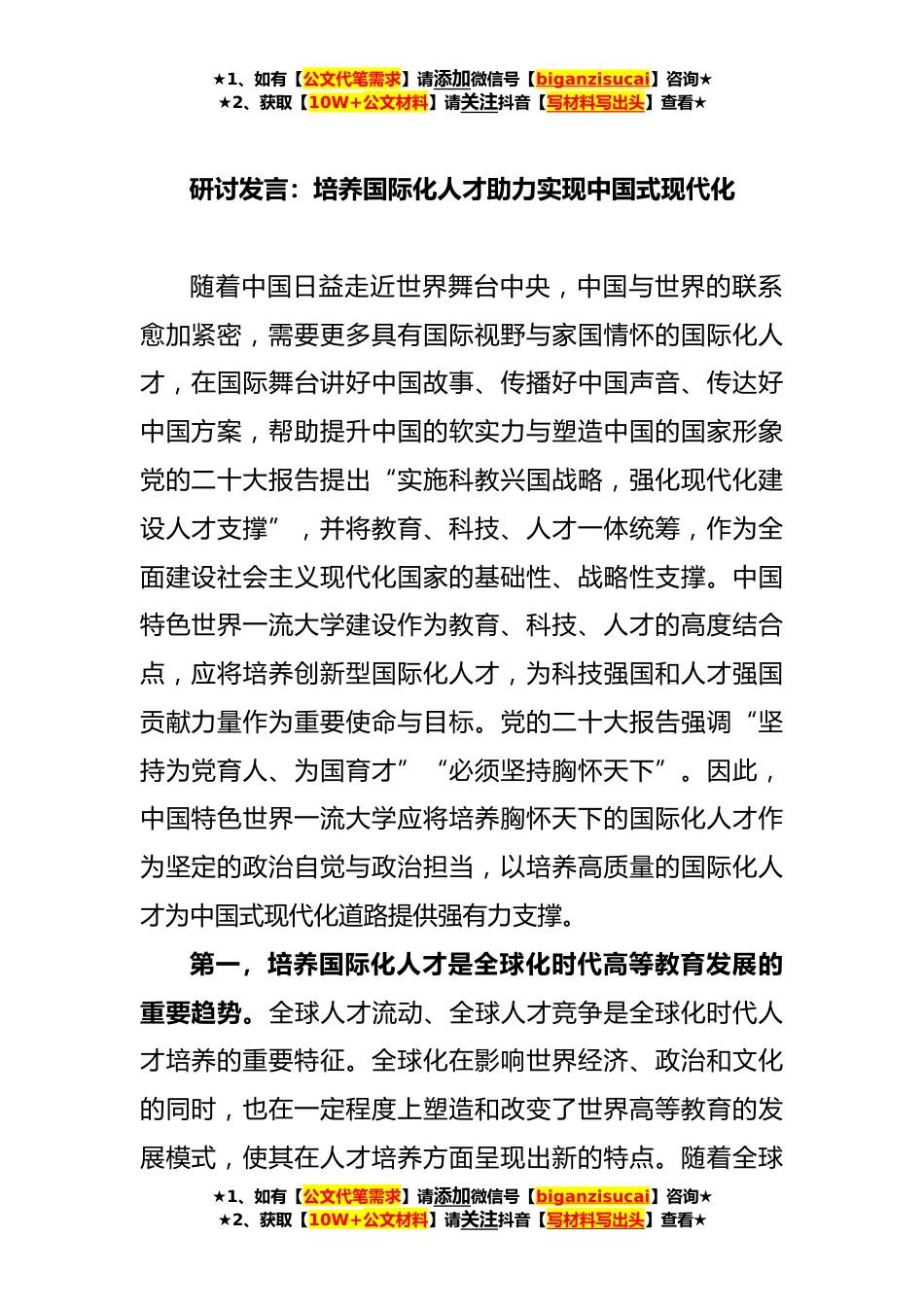 ★1、如有【公文代笔需求】请添加微信号【biganzisucai】咨询★★2、获取【10W+公文材料】请关注抖音【写材料写出头】查看★研讨发言:培养国际化人才助力实现中国式现代化随着中国日益走近世界舞台中央,中国与世界的联系愈加紧密,需要更多具有国际视野与家国情怀的国际化人才,在国际舞台讲好中国故事、传播好中国声音、传达好中国方案,帮助提升中国的软实力与塑造中国的国家形象党的二十大报告提出“实施科教兴国战略,强化现代化建设人才支撑”,并将教育、科技、人才一体统筹,作为全面建设社会主义现代化国家的基础性、战略性支撑。中国特色世界一流大学建设作为教育、科技、人才的高度结合点,应将培养创新型国际化人才,为科技强国和人才强国贡献力量作为重要使命与目标。党的二十大报告强调“坚持为党...