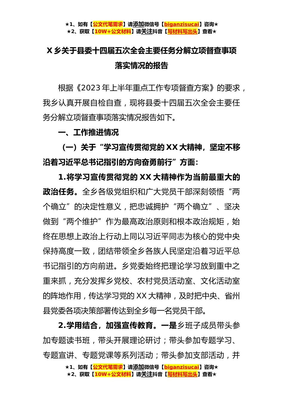★1、如有【公文代笔需求】请添加微信号【biganzisucai】咨询★★2、获取【10W+公文材料】请关注抖音【写材料写出头】查看★X乡关于县委十四届五次全会主要任务分解立项督查事项落实情况的报告根据《2023年上半年重点工作专项督查方案》的要求,我乡认真开展自检自查,现将县委十四届五次全会主要任务分解立项督查事项落实情况报告如下。一、工作推进情况(一)关于“学习宣传贯彻党的XX大精神,坚定不移沿着习近平总书记指引的方向奋勇前行”方面:1.将学习宣传贯彻党的XX大精神作为当前最重大的政治任务。全乡各级党组织和广大党员干部深刻领悟“两个确立”的决定性意义,把忠诚拥护“两个确立”、坚决做到“两个维护”作为最高政治原则和根本政治规矩,始终在思想上政治上行动上同以习近平同志为核心的党中央保...