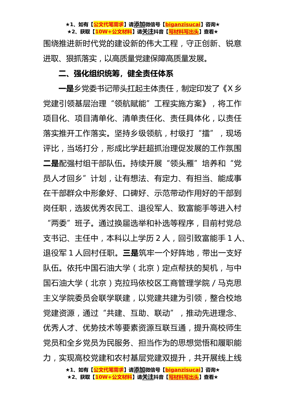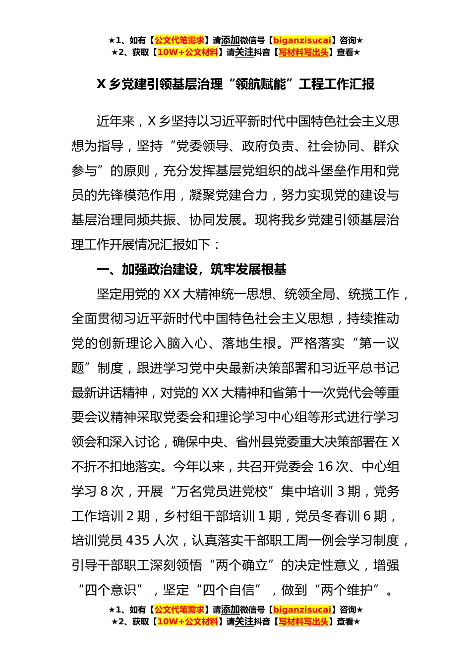 ★1、如有【公文代笔需求】请添加微信号【biganzisucai】咨询★★2、获取【10W+公文材料】请关注抖音【写材料写出头】查看★X乡党建引领基层治理“领航赋能”工程工作汇报近年来,X乡坚持以习近平新时代中国特色社会主义思想为指导,坚持“党委领导、政府负责、社会协同、群众参与”的原则,充分发挥基层党组织的战斗堡垒作用和党员的先锋模范作用,凝聚党建合力,努力实现党的建设与基层治理同频共振、协同发展。现将我乡党建引领基层治理工作开展情况汇报如下:一、加强政治建设,筑牢发展根基坚定用党的XX大精神统一思想、统领全局、统揽工作,全面贯彻习近平新时代中国特色社会主义思想,持续推动党的创新理论入脑入心、落地生根。严格落实“第一议题”制度,跟进学习党中央最新决策部署和习近平总书记最新讲...