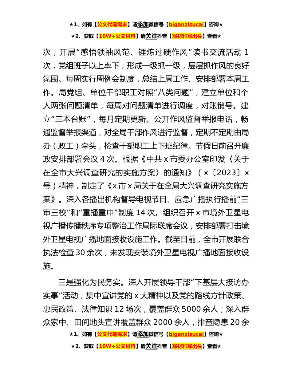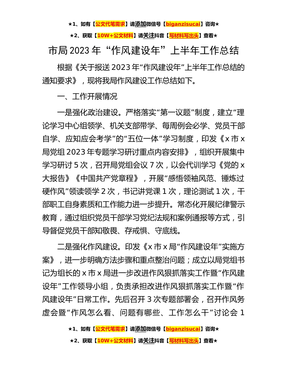 ★1、如有【公文代笔需求】请添加微信号【biganzisucai】咨询★★2、获取【10W+公文材料】请关注抖音【写材料写出头】查看★市局2023年“作风建设年”上半年工作总结根据《关于报送2023“”年作风建设年上半年工作总结的通知要求》,现将我局作风建设工作总结如下。一、工作开展情况“”“一是强化政治建设。严格落实第一议题制度,建立理论学习中心组领学、机关支部带学、每周例会必学、党员干部”“”自学、应知应会考学的五位一体学习制度,印发《x市x局党组2023年专题学习研讨重点内容安排》,组织开展集中学习研讨5次,召开局党组会议7次,以会代训学习《党的x“大报告》《中国共产党章程》,开展感悟领袖风范、锤炼过”硬作风领读领学2次,书记讲党课1次,理论测试1次,干部职工自身素质和工作能力进一步提...