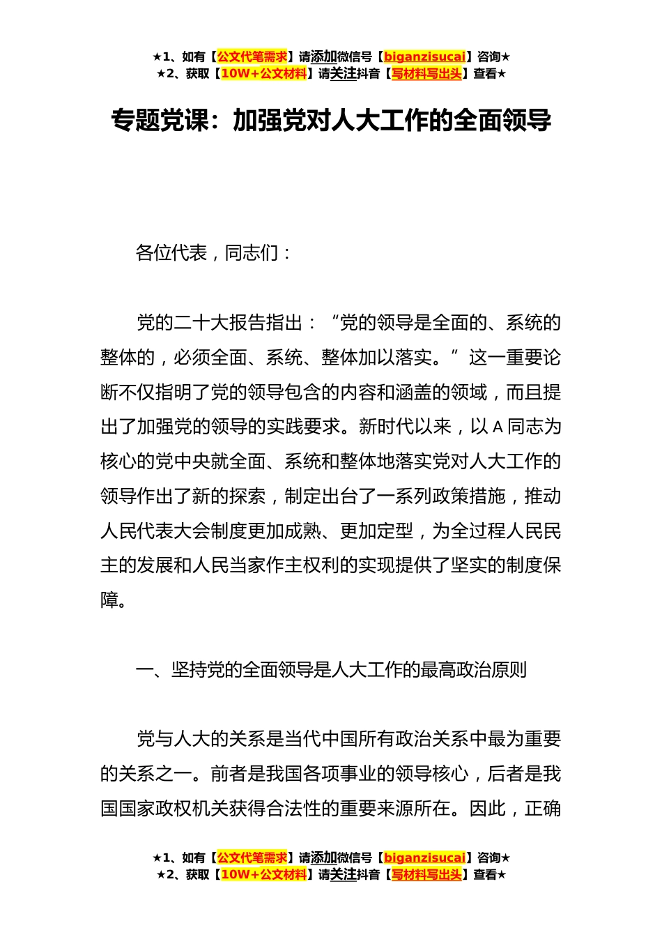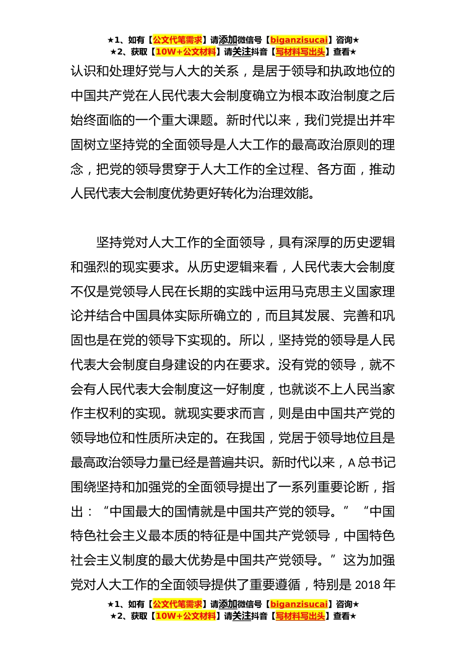 ★1、如有【公文代笔需求】请添加微信号【biganzisucai】咨询★★2、获取【10W+公文材料】请关注抖音【写材料写出头】查看★专题党课:加强党对人大工作的全面领导各位代表,同志们:党的二十大报告指出:“党的领导是全面的、系统的整体的,必须全面、系统、整体加以落实。”这一重要论断不仅指明了党的领导包含的内容和涵盖的领域,而且提出了加强党的领导的实践要求。新时代以来,以A同志为核心的党中央就全面、系统和整体地落实党对人大工作的领导作出了新的探索,制定出台了一系列政策措施,推动人民代表大会制度更加成熟、更加定型,为全过程人民民主的发展和人民当家作主权利的实现提供了坚实的制度保障。一、坚持党的全面领导是人大工作的最高政治原则党与人大的关系是当代中国所有政治关系中最为重要的关...