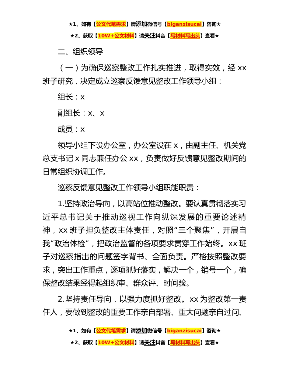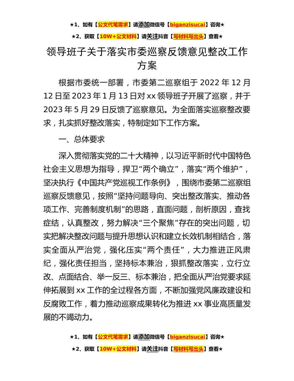 ★1、如有【公文代笔需求】请添加微信号【biganzisucai】咨询★★2、获取【10W+公文材料】请关注抖音【写材料写出头】查看★领导班子关于落实市委巡察反馈意见整改工作方案根据市委统一部署,市委第二巡察组于2022年12月12日至2023年1月13日对xx领导班子开展了巡察,并于2023年5月29日反馈了巡察意见。为全面落实巡察整改要求,扎实抓好整改落实,特制定如下工作方案。一、总体要求深入贯彻落实党的二十大精神,以习近平新时代中国特色“”“”社会主义思想为指导,捍卫两个确立,落实两个维护,坚决执行《中国共产党巡视工作条例》,围绕市委第二巡察组“巡察反馈意见,按照坚持问题导向、突出整改落实、推动各”项工作、完善制度机制的思路,直面问题,剖析原因,查找“”症结,认真整改,努力解决三个聚焦存在...